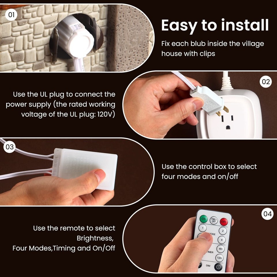 Keep your Tabletop Village and Deco Shining Bright: Our lighting system take ceramic and break-proof bulbs that can evenly disperse the light, giving it a solid glow, fits most craft objects, a good decoration for your Village Houses, Holiday Decorations, Pumpkin blow mold, etc.