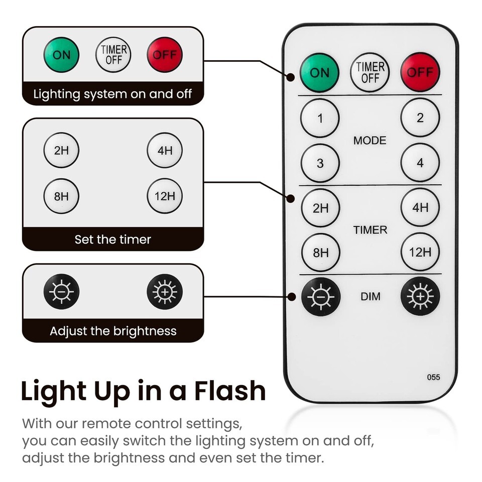 Light Up in a Flash: With our remote control settings, you can easily switch the lighting system on and off and even set the timer off as well as 4 lighting modes with constant light, breathing, fast flashing, and slow flashing to match your decorating need.