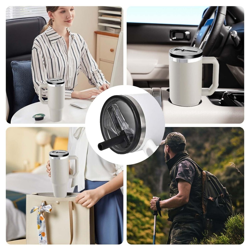 INNOVATIVE FLIP STRAW DESIGN: The spill proof replacement lid fit for 40 oz Stanley has a built-in foldable straw, which can be quickly unfolded or folded by pressing a button, and it's suitable for scenes such as car cup holders and backpack side pockets. You can enjoy a smooth drinking experience at any time during outdoor hiking and traveling.