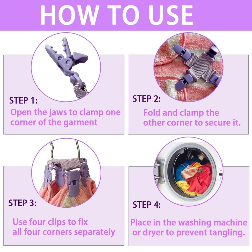 Easy to UseThe clips are incredibly simple to use. Just open the buckle, insert the four corners of your bed sheet, secure the lock, and you're ready to go. They make drying sheets hassle-free and keep them neatly separated during the drying cycle.