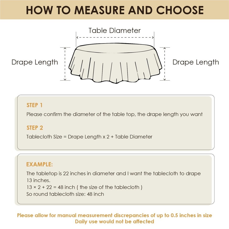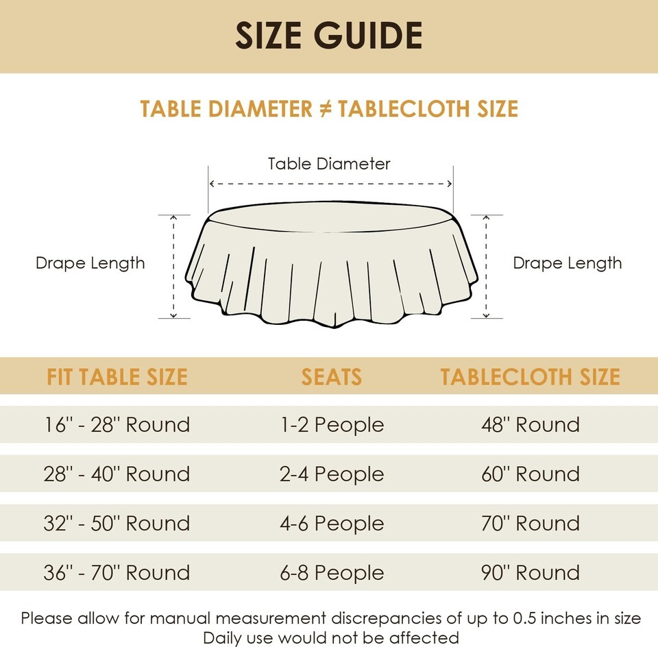 PACKAGE CONTAINS - 1 piece round table cloth measuring 70 inches in diameter. Please refer to the size chart before purchasing.