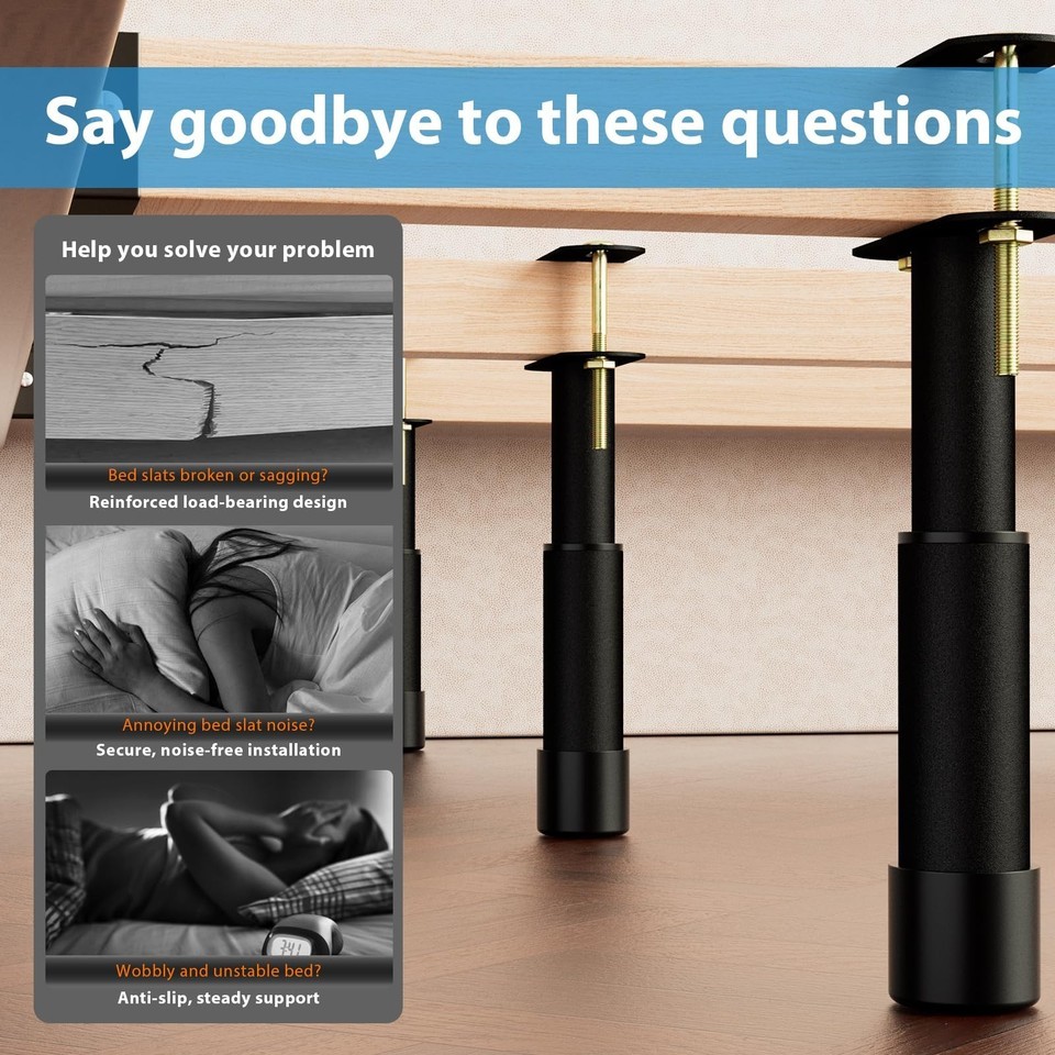 Premium Material: Our Adjustable Bed Risers use 38 carbon steel tubes, making them anti-rust and durable. The matte finish provides a non-slip grip during installation, and the circular base design helps avoid slipping, keeping the Bed Slat Support Legs steady