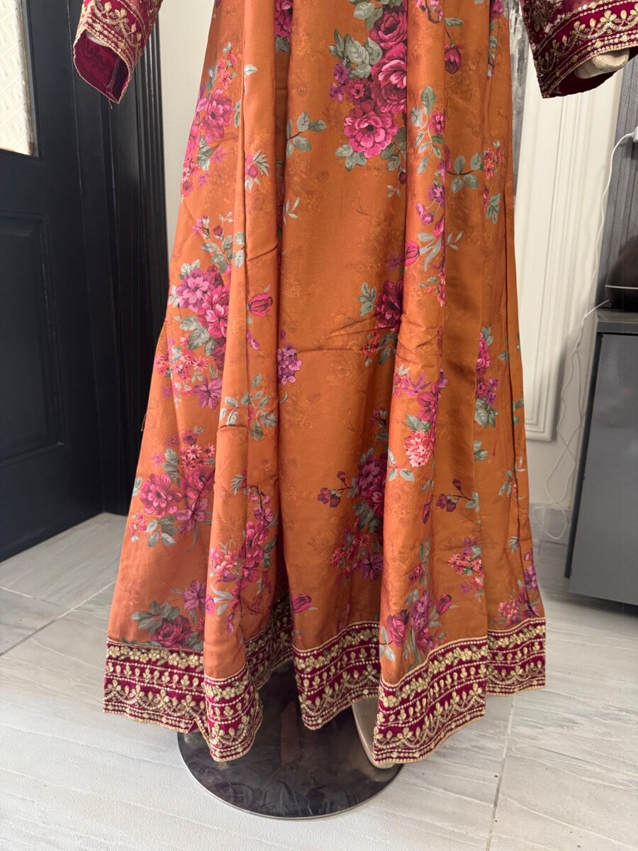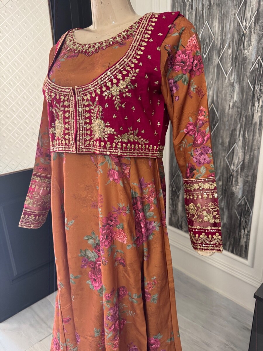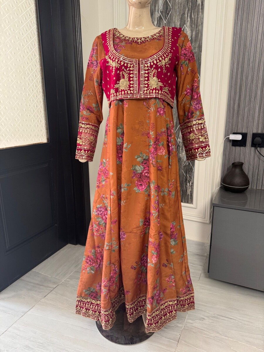 ? Rust printed katan silk long Maxi dress, boarder with fancy thread embroidery Sequins work, fancy thread embroidery Sequins work on arm,waist coat is full embroidered.