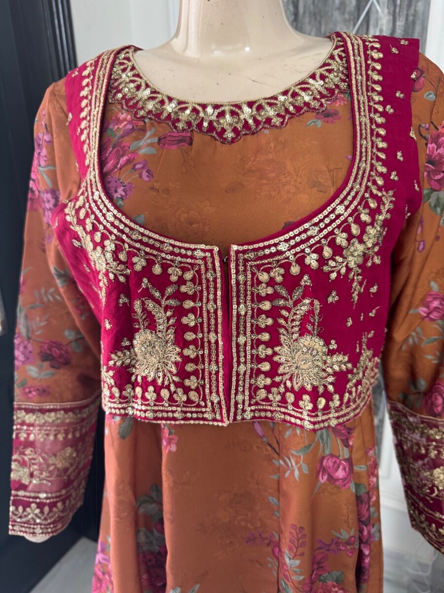 Pakistani Rust Long Maxi Style Embroidered Sequins work Dress,L