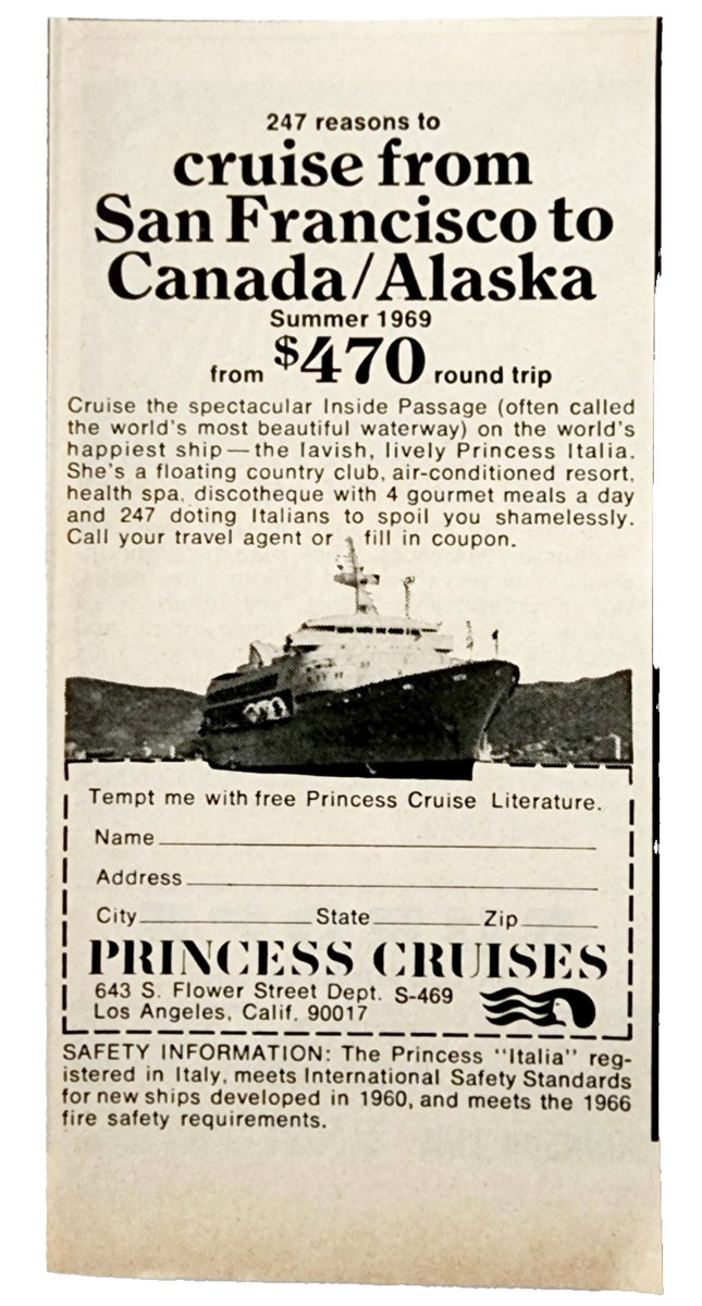 1969 Princess Cruises Advertisement San Francisco To Alaska Travel G2B