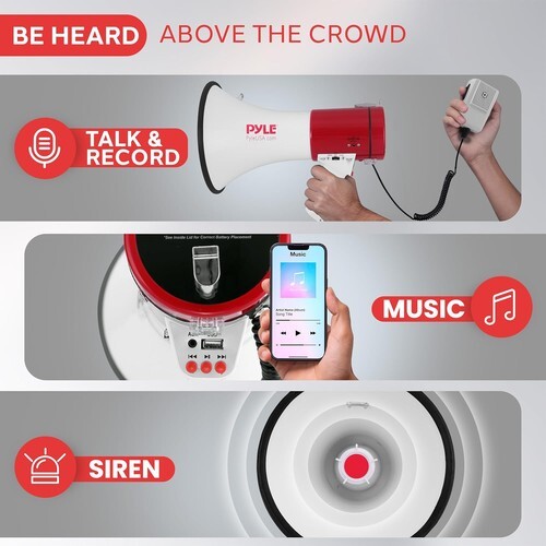 * SIREN ALARM MODE: Amplifies an emergency tone with adjustable volume control through the megaphone speaker. Pyle PMP58U megaphone bullhorn needs 8 C batteries features a built-in siren so you can get everyone?s attention fast. Be heard loud and clear