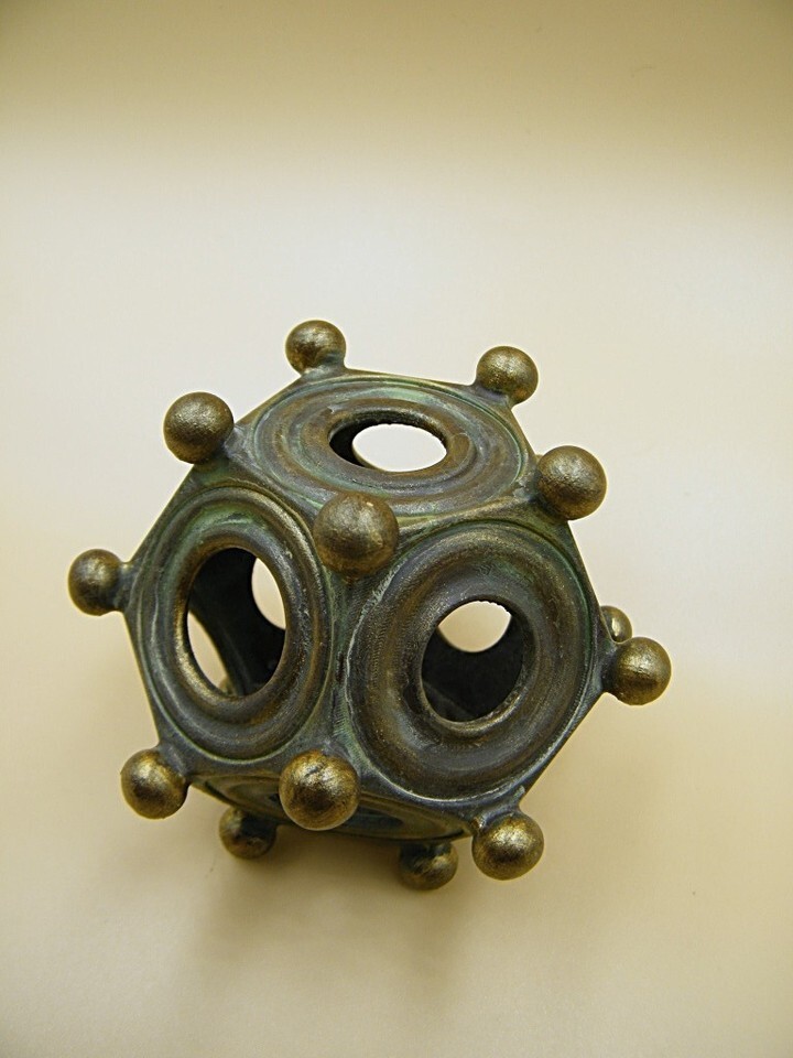 A Roman dodecahedron or Gallo-Roman dodecahedron is a small hollow object made of copper alloy which has been cast into a regular dodecahedral shape: twelve flat pentagonal faces, each face having a circular hole of varying diameter in the middle, the holes connecting to the hollow center. Roman dodecahedra date from the 2nd to 4th centuries AD.