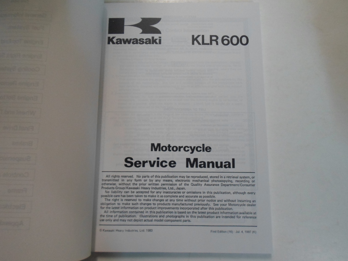 Full of information and illustrations, step by step instructions, assembly/dis-assembly, exploded illustrations/diagrams/troubleshooting, great manual to have when owning a KLR600 and will keep your BIKE on the road. This manual will save you money in repairs/service.