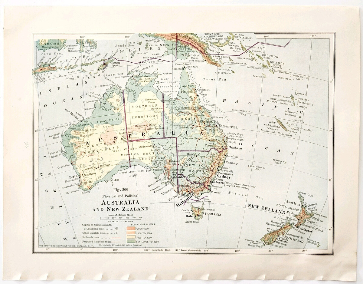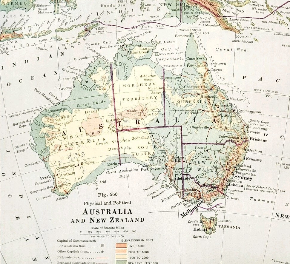 1916 Map Australia New Zealand Oceania Physical Political Boundaries DWSS9