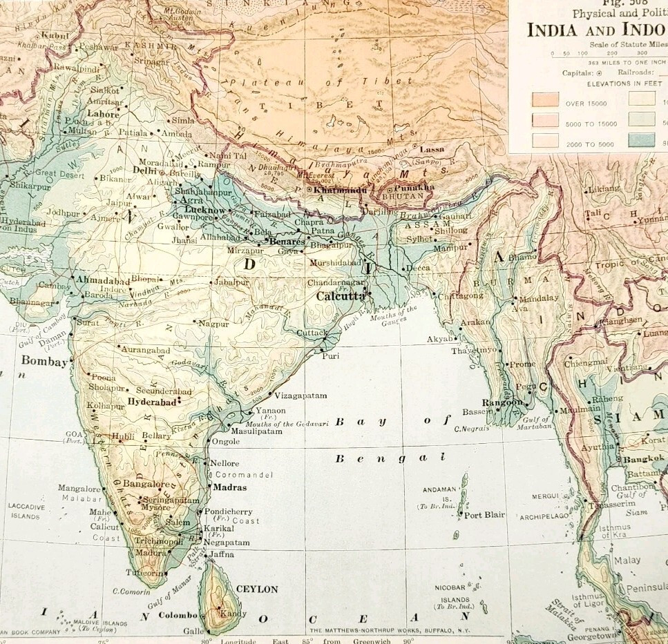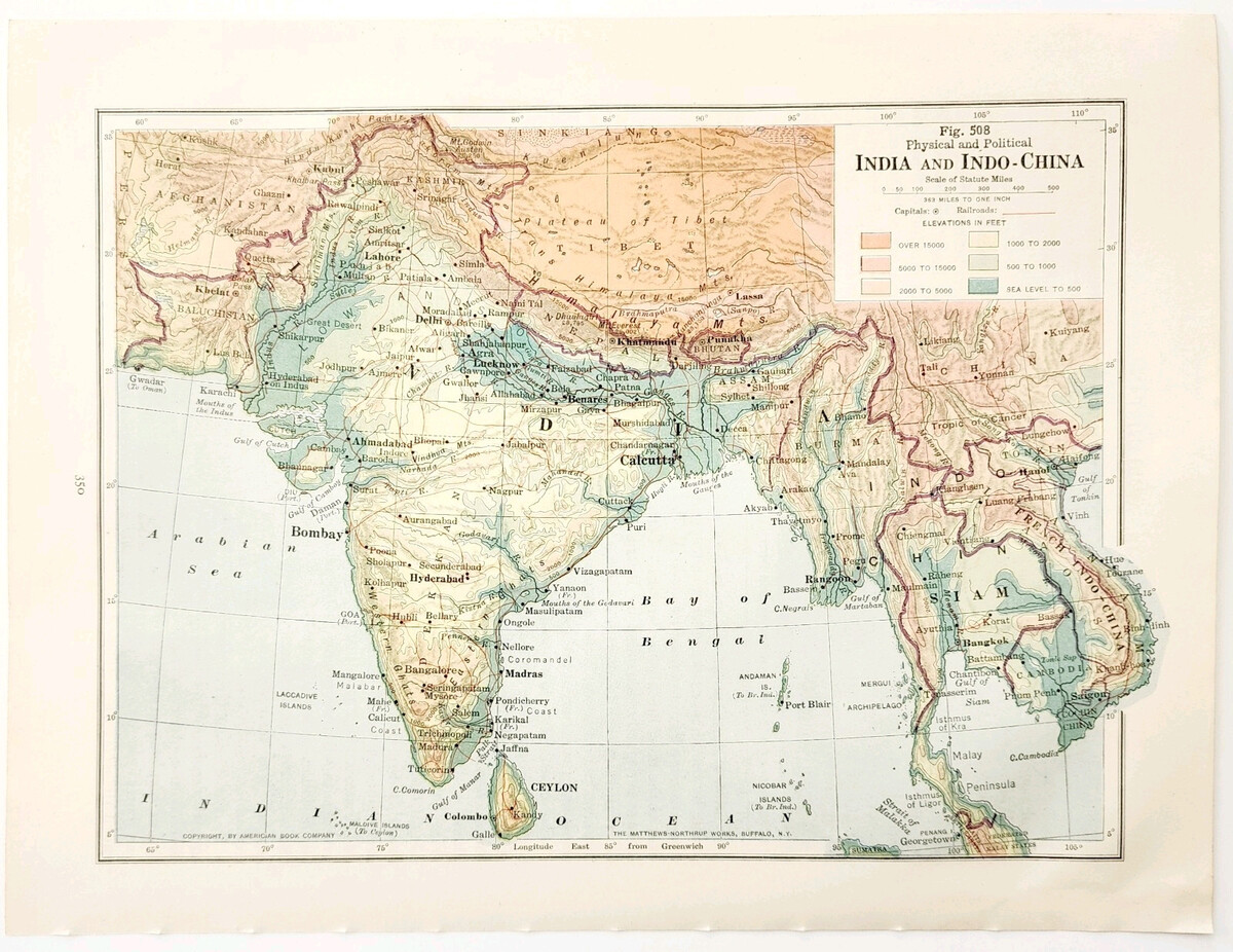 1916 Map India Indo China Tibet Plateau Physical Political Boundaries DWSS9