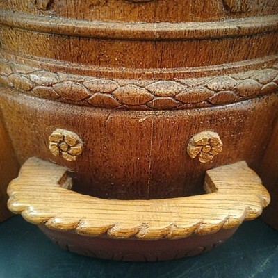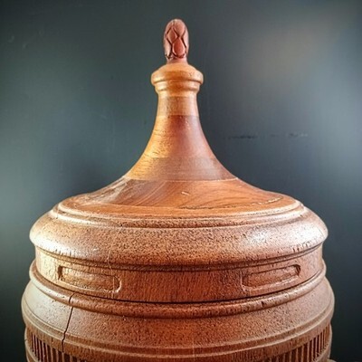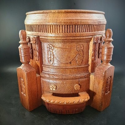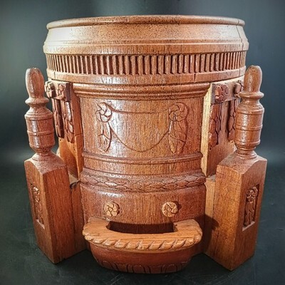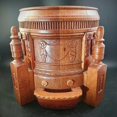 "This hand-carved wood Caja de Agua model from San Luis Potosí, Mexico is a unique piece measuring 15" in height and 10.5" in diameter. This rare collectible is a traditional storage and water container featuring intricate sculptural carving, a removable lid, and a round design. The piece showcases Mexican cultural heritage, architecture, and landmarks, making it a meaningful souvenir for travel enthusiasts or collectors of Mexican artistry. Handmade in Mexico, this piece is both functional and decorative, suitable for display on furniture or shelves."