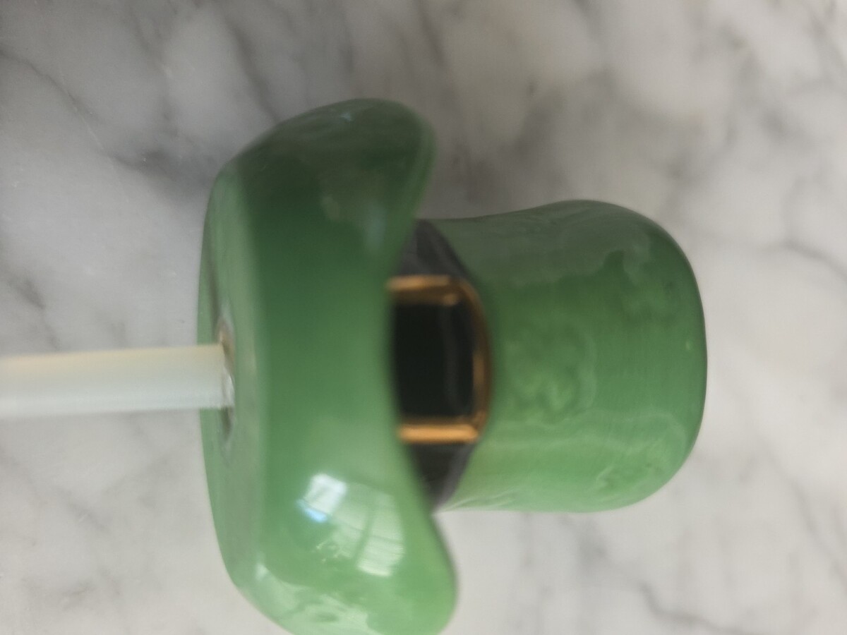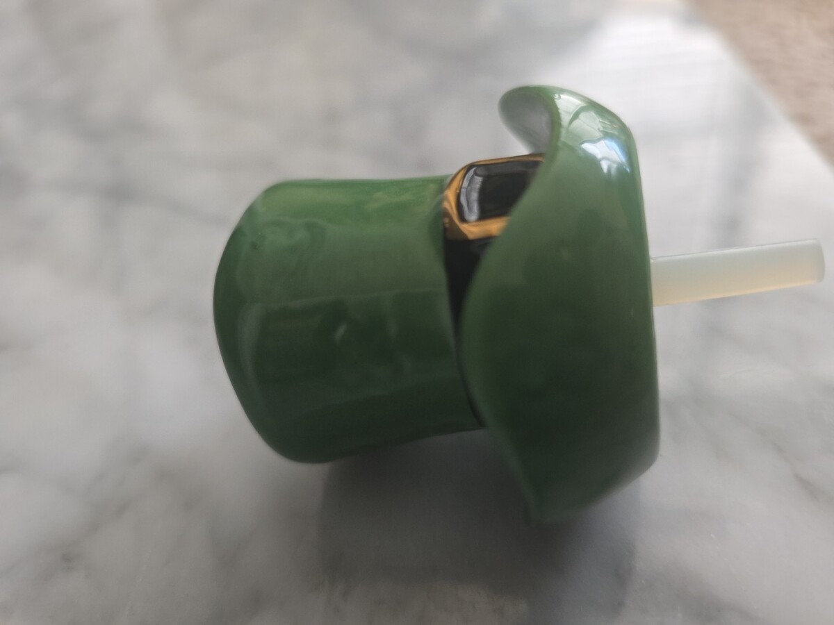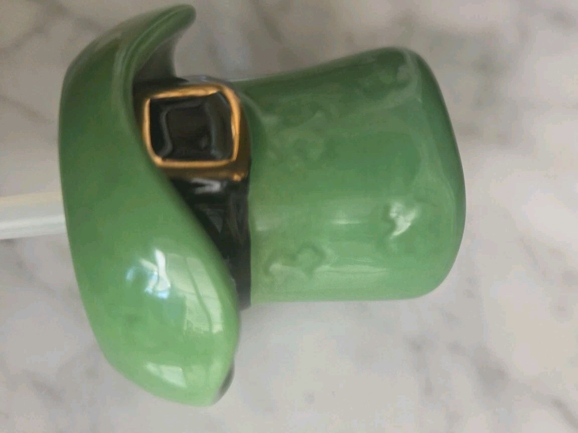 This product is a rare and retired Nora Fleming mini ceramic hat featuring embossed shamrocks, perfect for St. Patrick's Day. The glossy green hat is small in size and adorned with a novelty shamrock pattern, making it a unique and collectible piece for your home decor. Perfect for adding a touch of whimsy to your kitchen or dining room, this Nora Fleming Leprechaun Hat Mini is a charming addition to your collection.