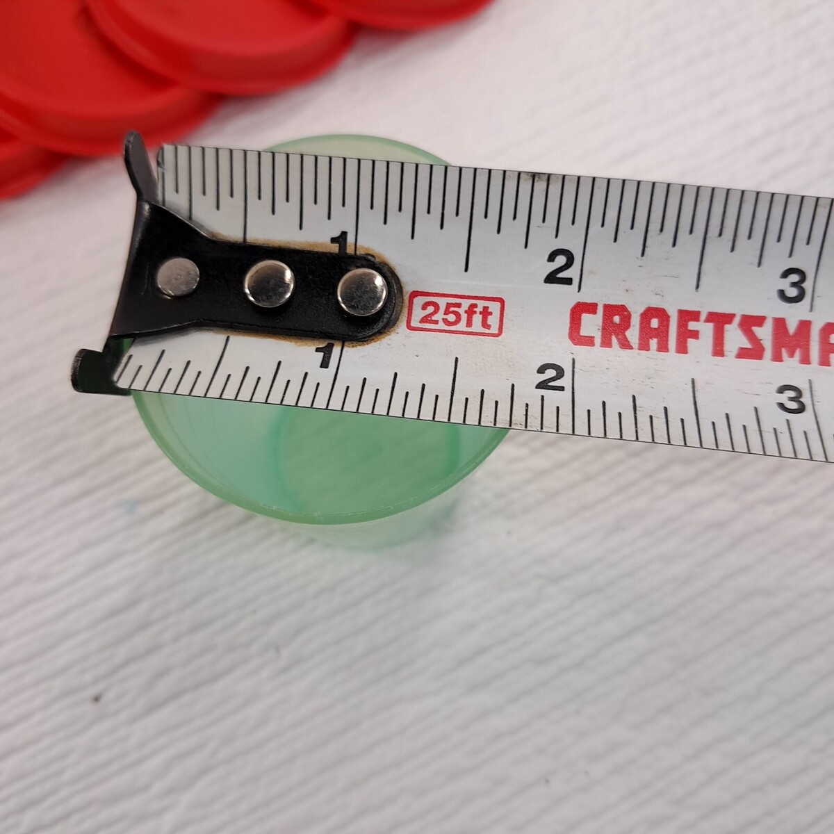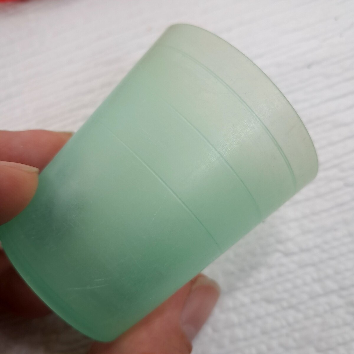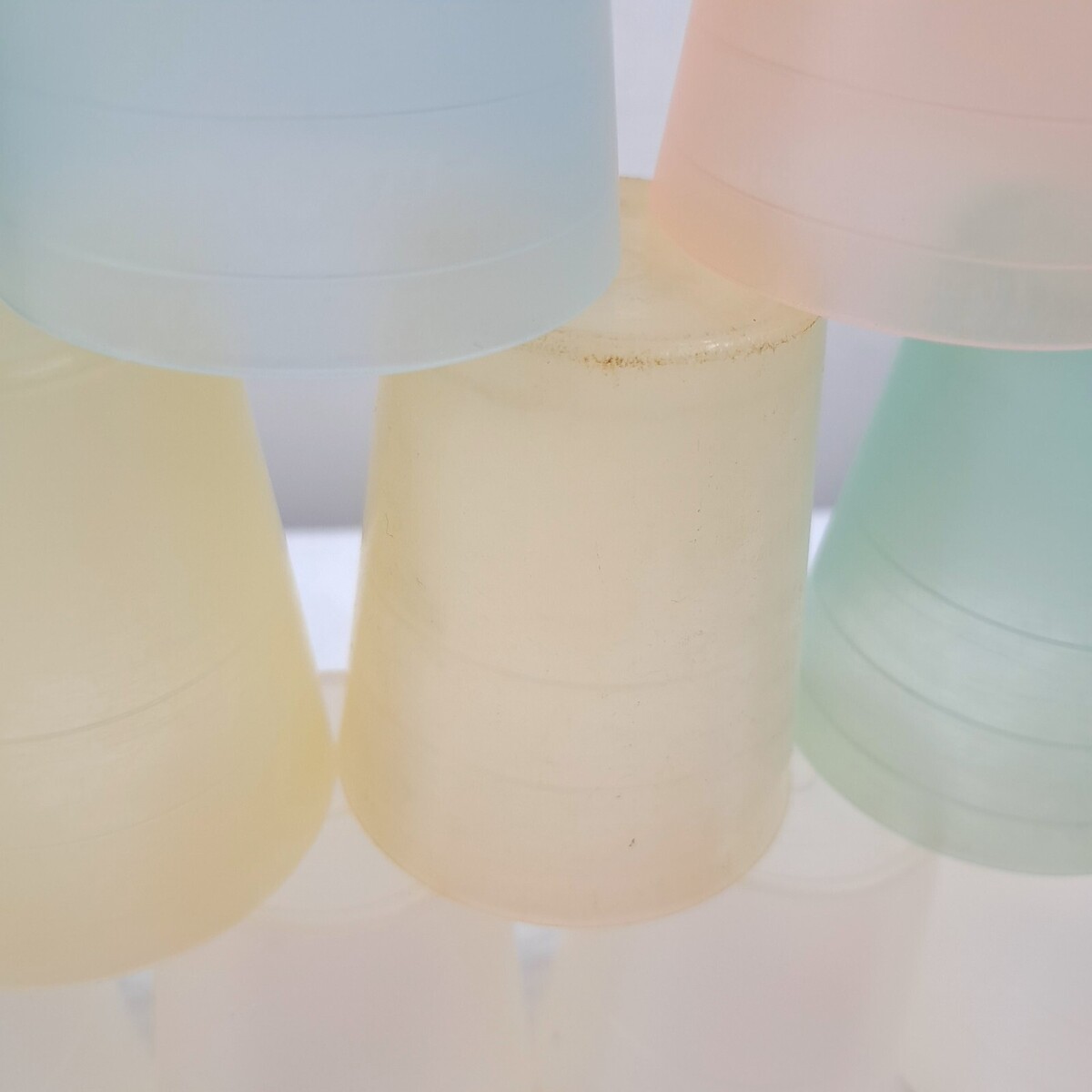 Set 14 mini containers with 6 lids. Containers have scuffs/scratches/wear as shown. Most of the containers are semi sheer, in colors of pink, green, blue and yellow and clear.
