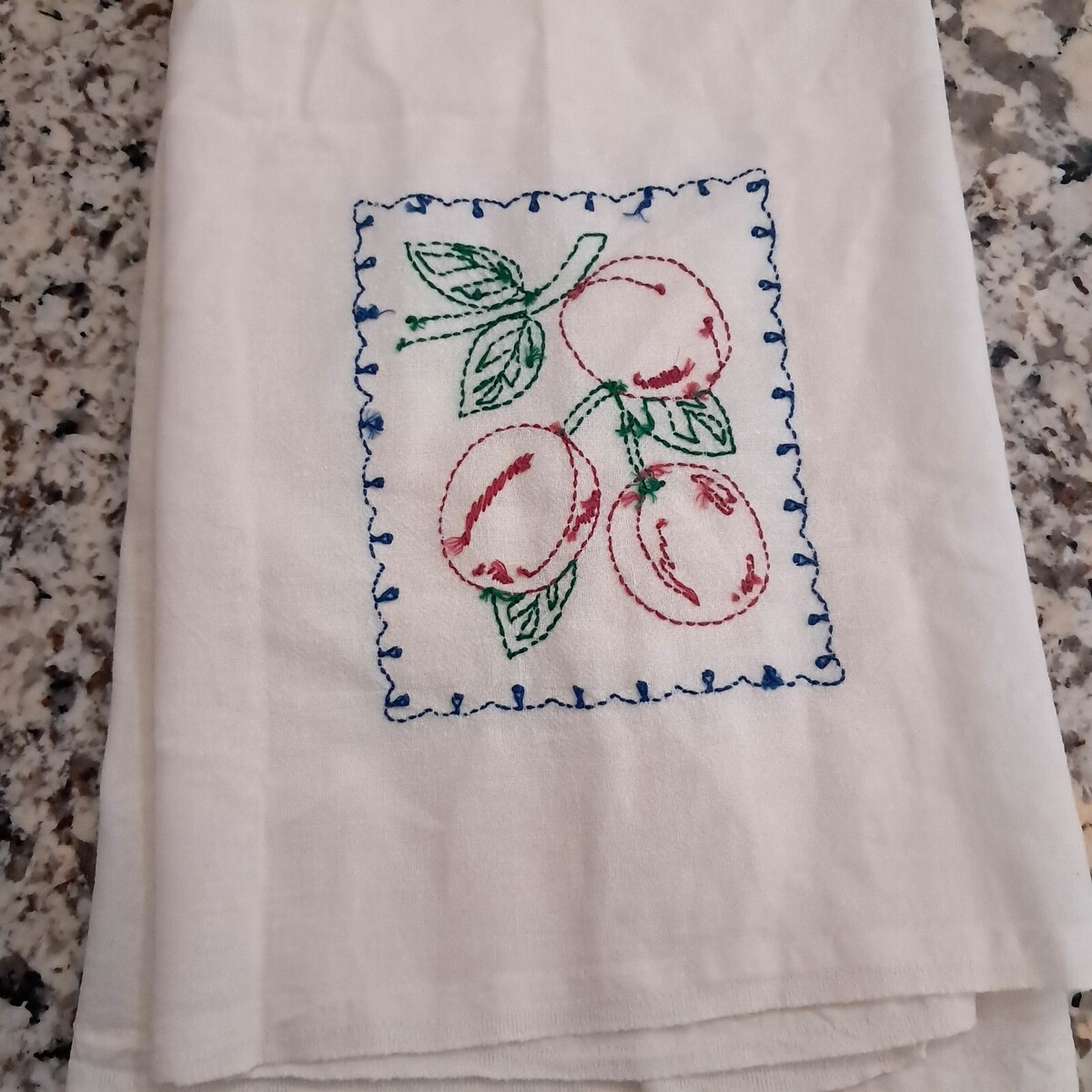 Vintage Embroidered towel cherry plum nectarine peach fruit floral Tea flour
