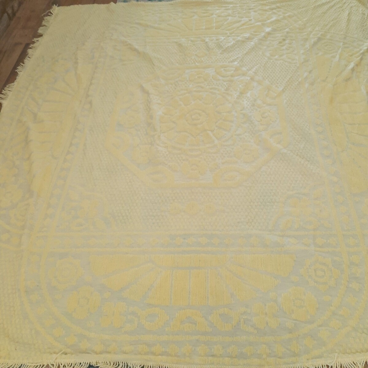 Vintage Chenille Bedspread FULL Blanket Yellow Daisy Flowers geometric Fringe