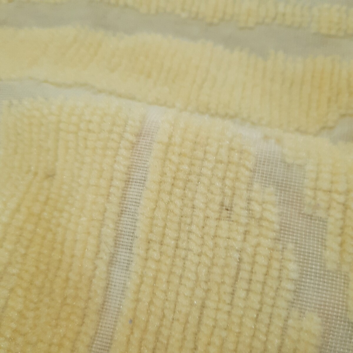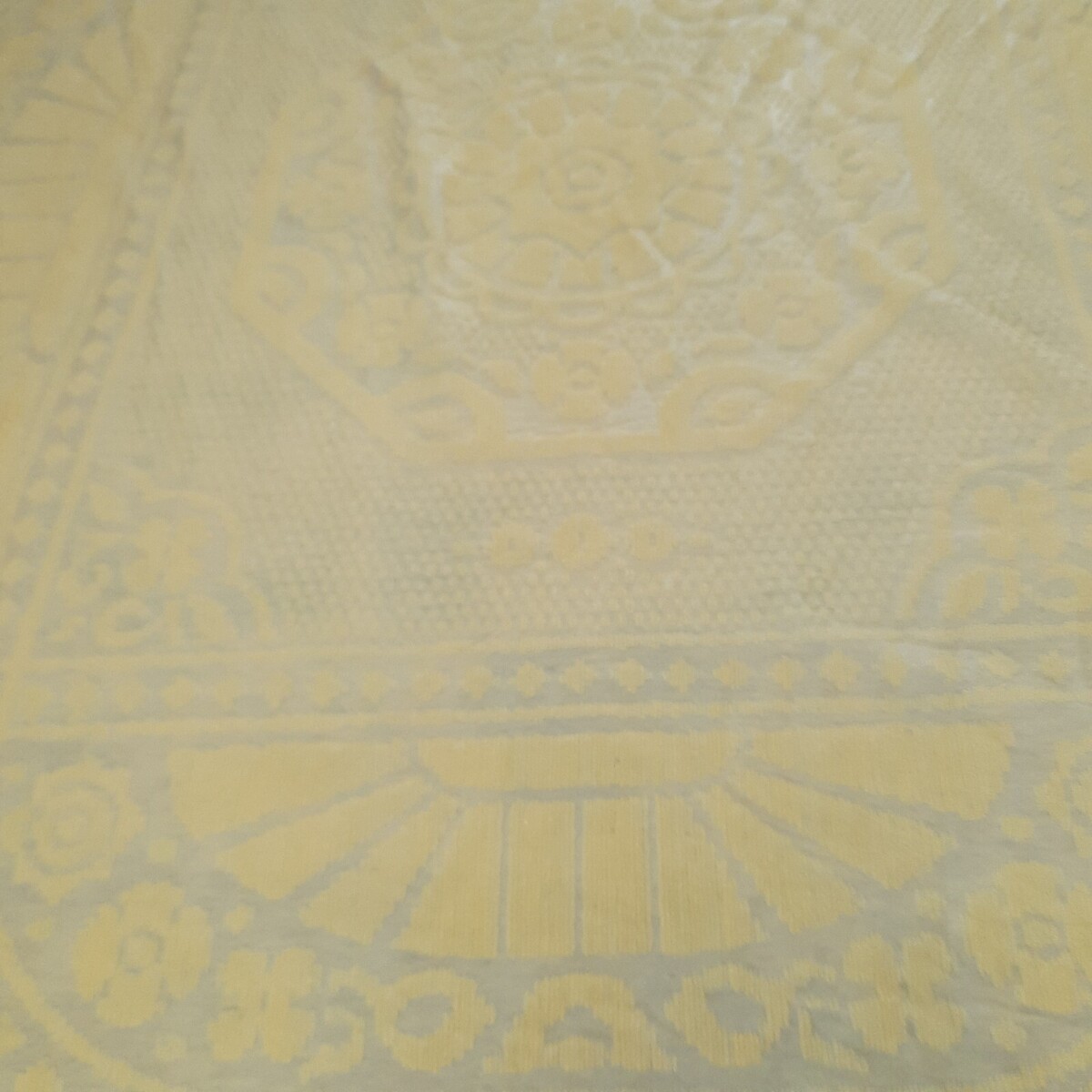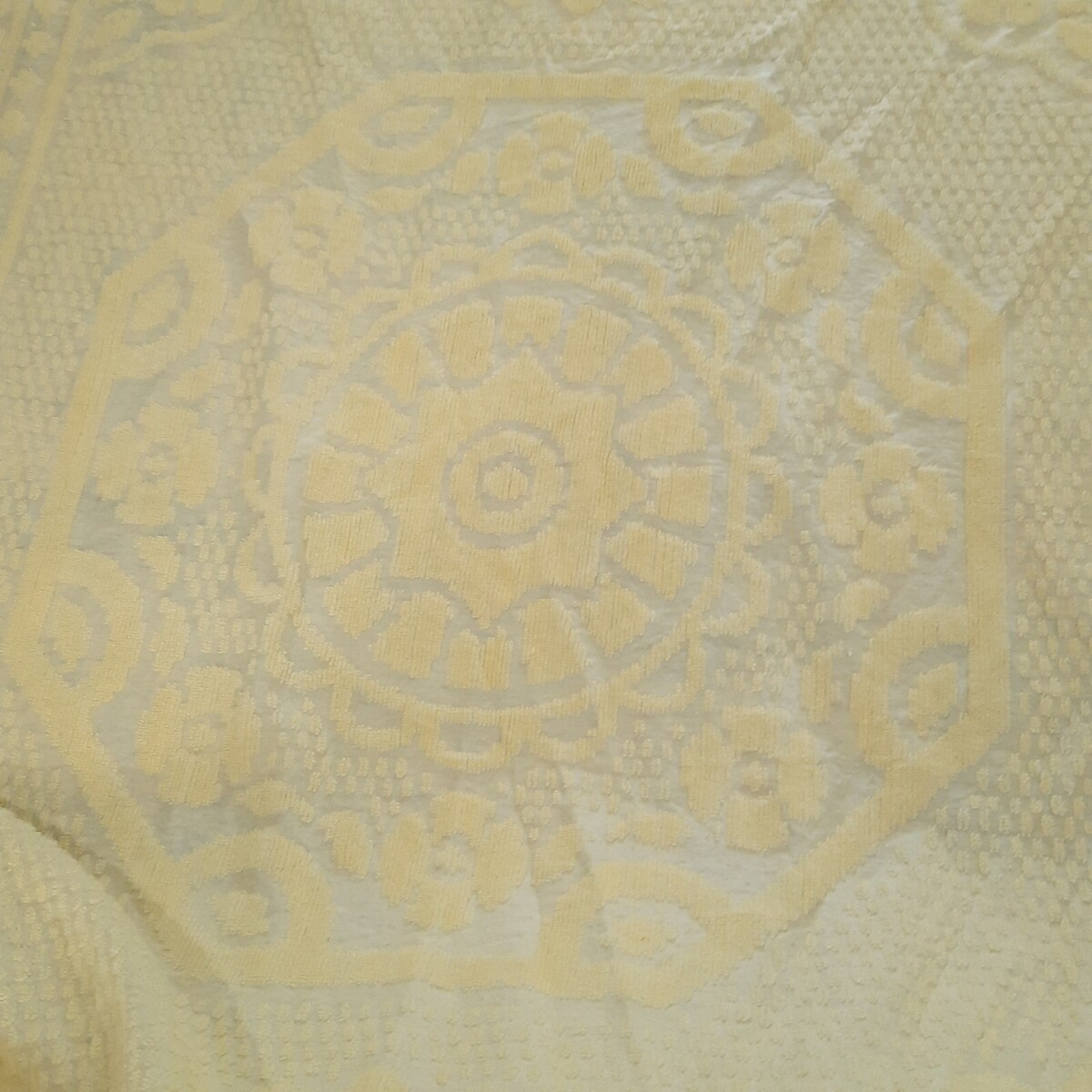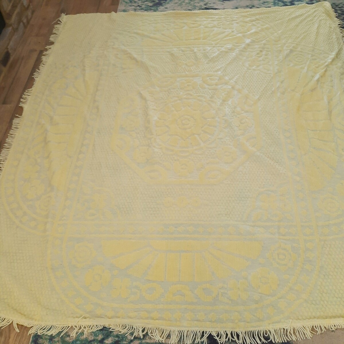 Approx 100x116 excluding fringe. Fits full size bed. Semi sheer with chenille pattern. Color doesn't show well in pics but is a nice sunny butter yellow. Some thinning spots as shown. Super cute! See pics.