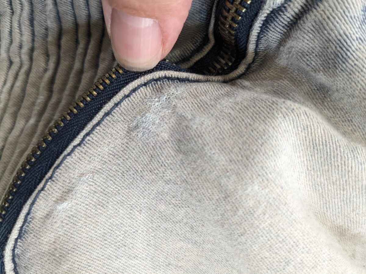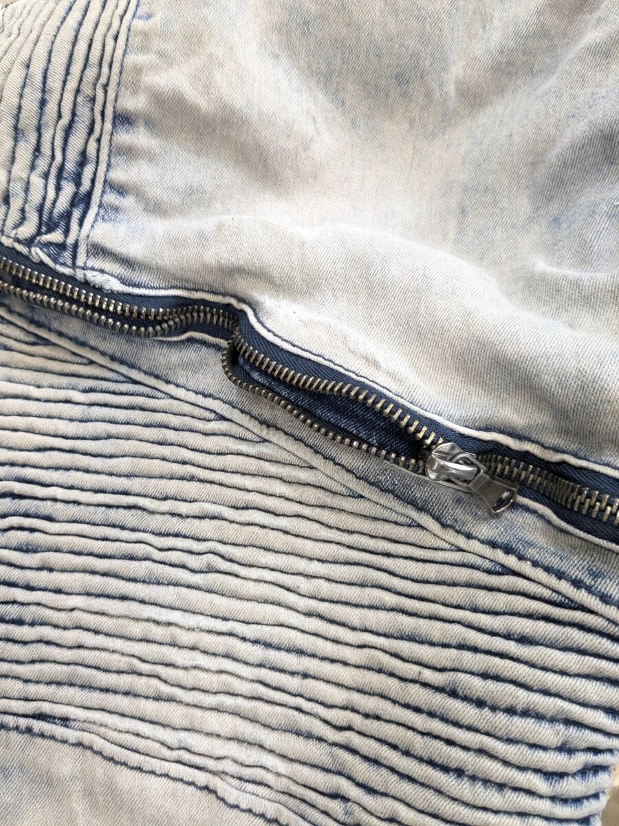 Several spots of thinning fabric as shown. Zipper accents on the leg with pleats, tears/frays etc. See pics for measurements.