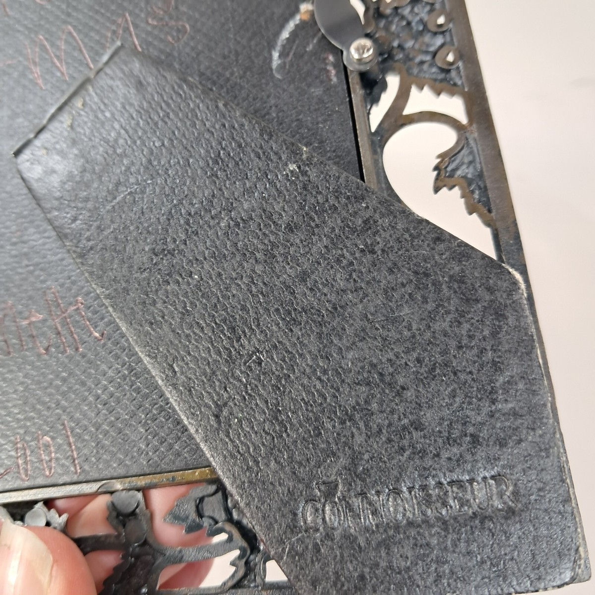 Metal frame holds 3.5x5" photo. Message written on back of cardboard, but otherwise very good condition.