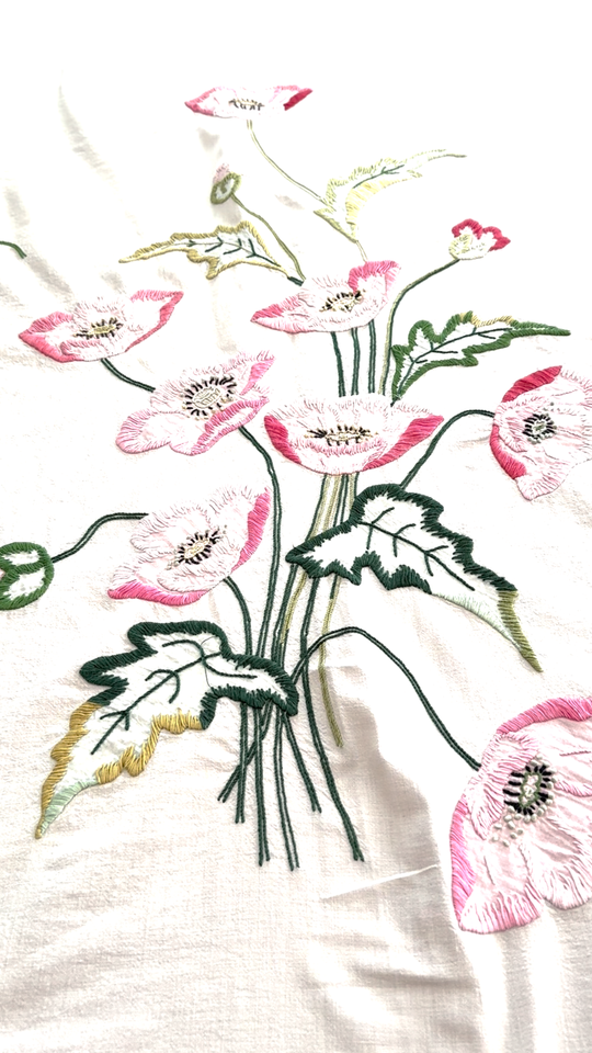 Pink Poppies Cottage Core Embroidered Tablecloth 64x84 Flower Garden Granny Core