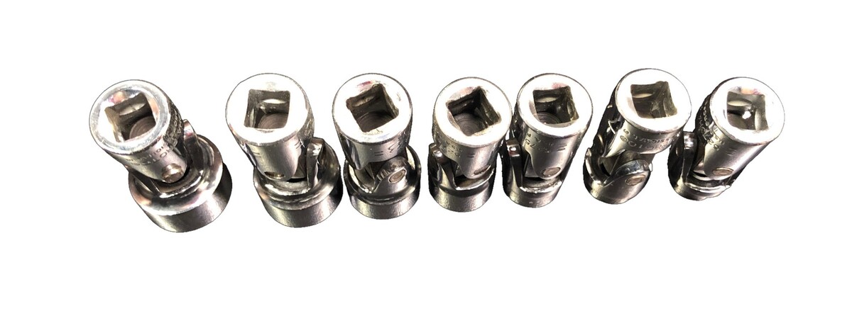 Category: Loose hand toolsType: SocketsBrand: ProtoModel number: Swivel Socket SetSize: 7PCColor: ChromeModel name: SAE 6PT Swivel Socket SetPower source: Hand-heldDrive Size: 3/8Condition:UsedNotes:3/4, 11/16, 5/8, 9/16, 1/2, 7/16, 3/8