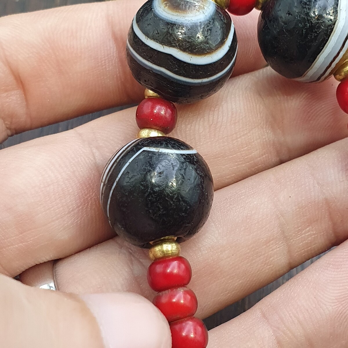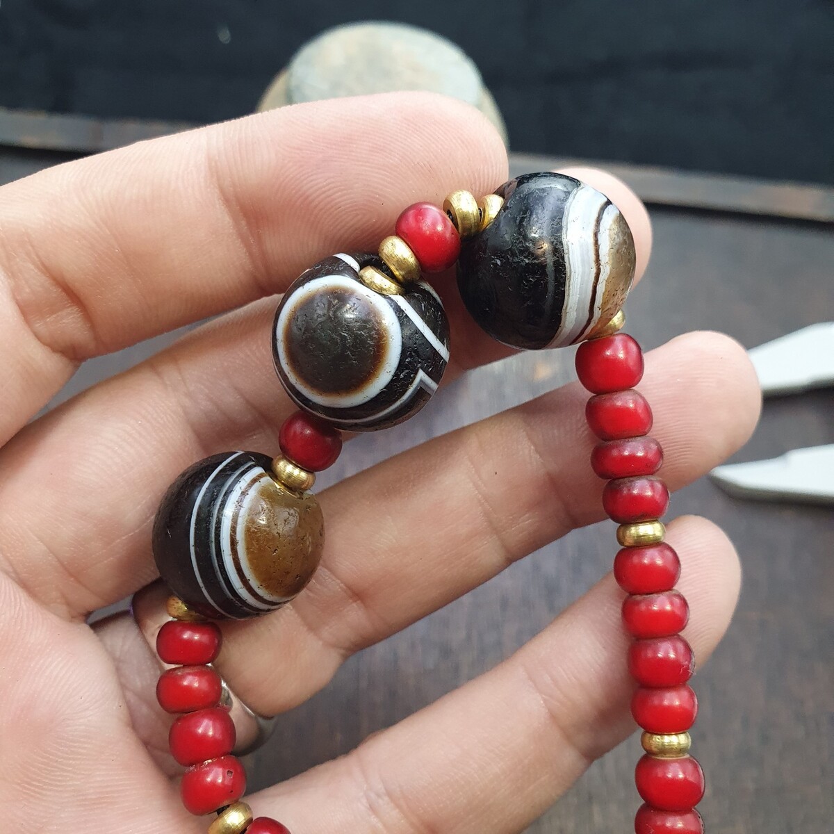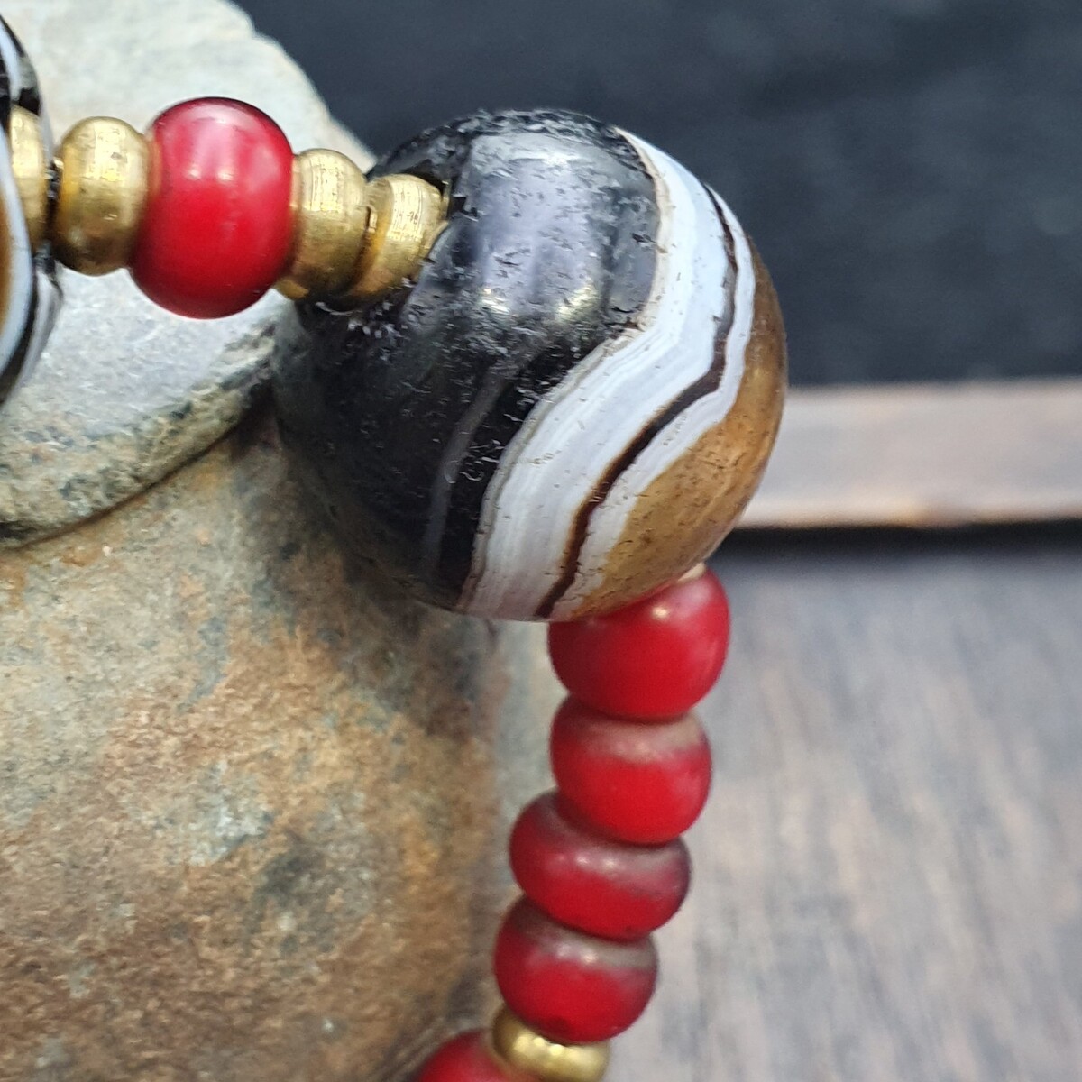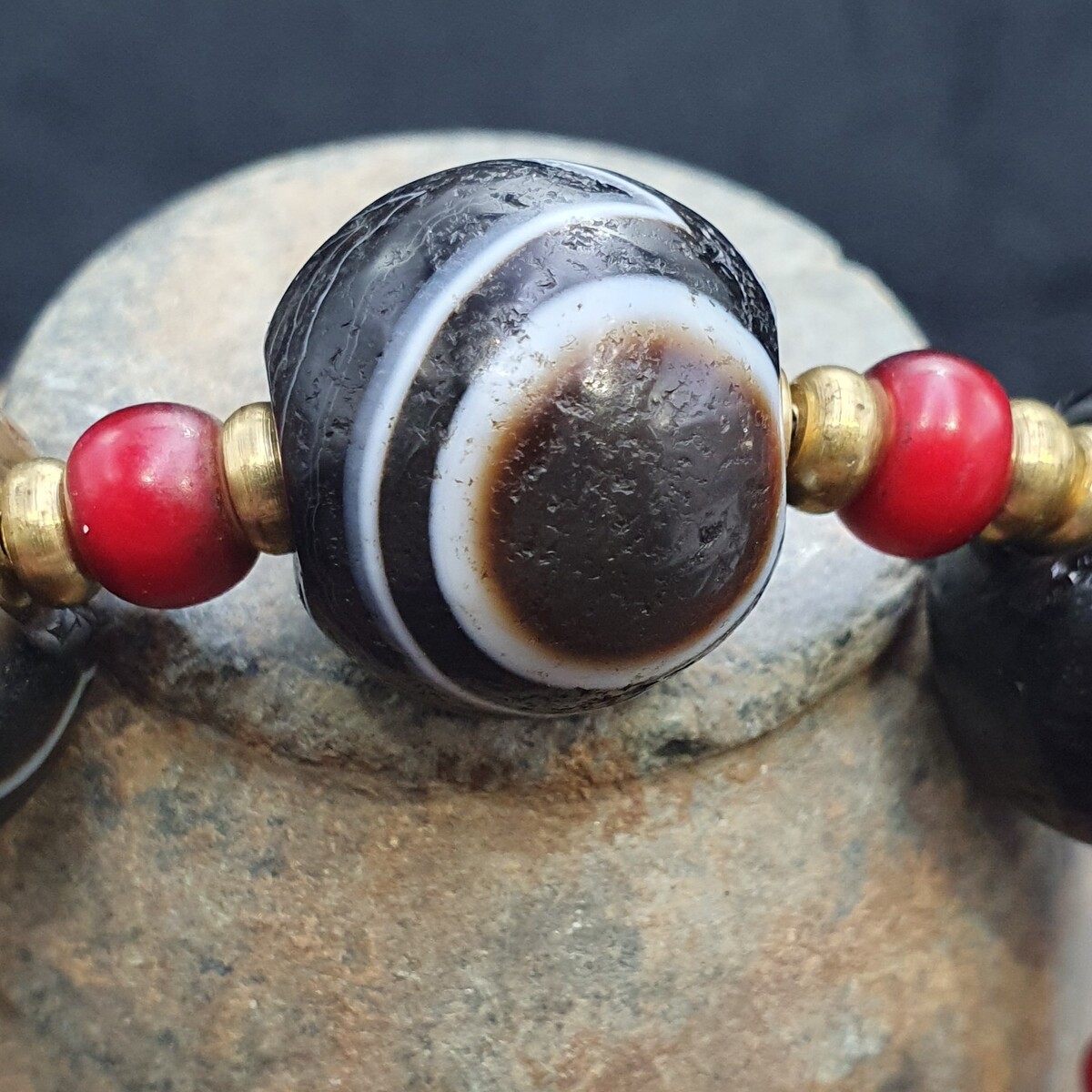 This Himalaya goat eye agate stone bead suleimani agate red whiteheart beads bracelet originates from Tibet and features a unique multi-color design with antique style. Made from stone materials, this original piece showcases intricate craftsmanship and a beautiful red and white heart pattern. Perfect for those seeking a rare and unique accessory with a touch of history and culture.