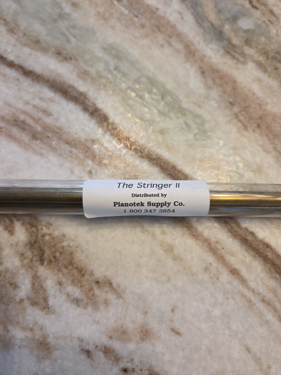 String insert tool kit. The stringer II is used to insert copper wound strings, unisons, and single strings on grand and vertical pianos without removing the action. The kit includes 3 sections of threaded brass which can combined for lengths of 16", 32" and 48", also includes the string separator cap and a bridge wire positioner (for combination handle)