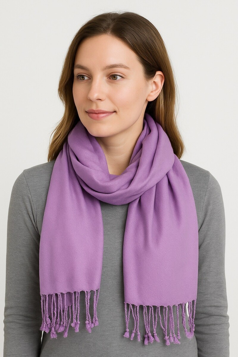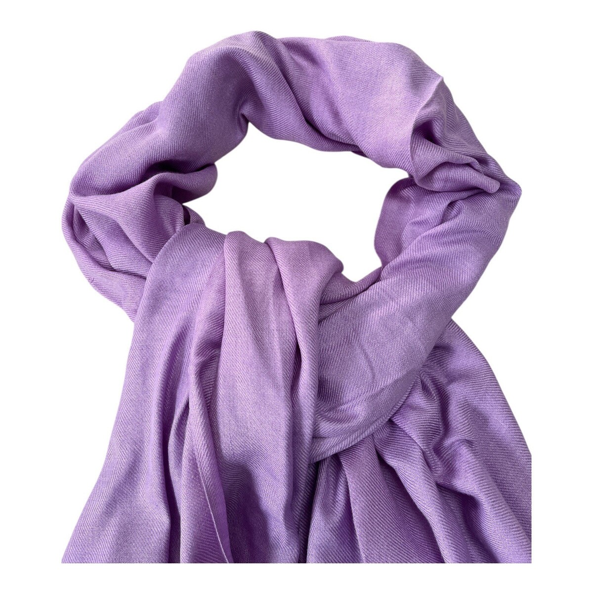Elegant lilac **Bijoux Terner Pseudo Pashmina scarf** crafted from soft 100% viscose. This lightweight wrap adds a touch of sophistication to any outfit and drapes beautifully for both casual and dressy occasions. Finished with twisted fringe ends and a subtle sheen for a refined look.