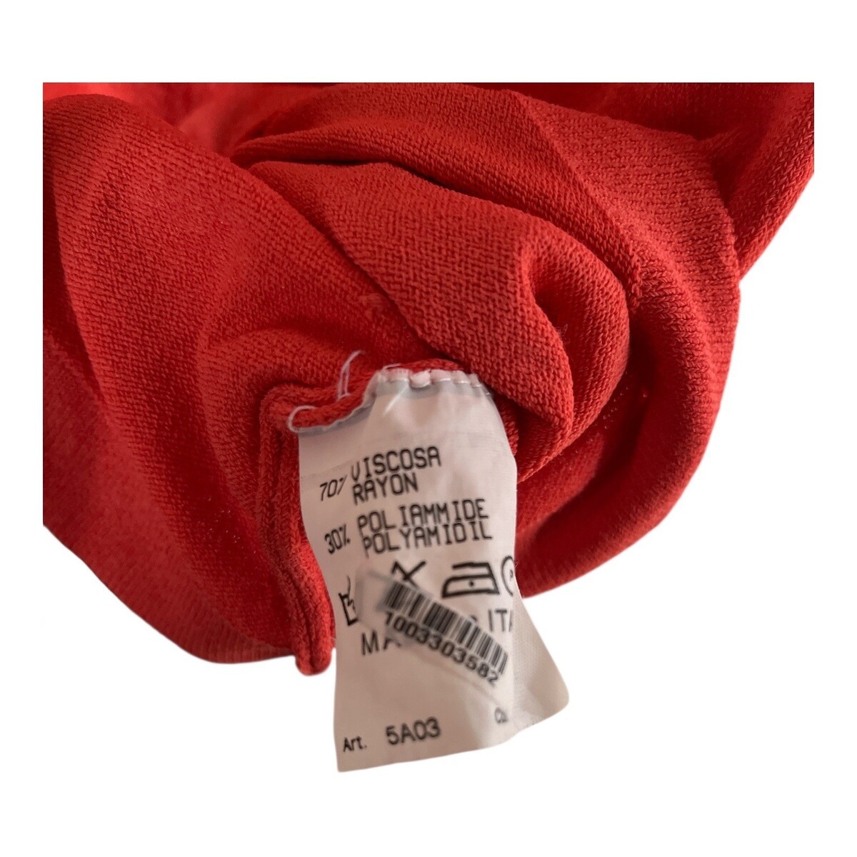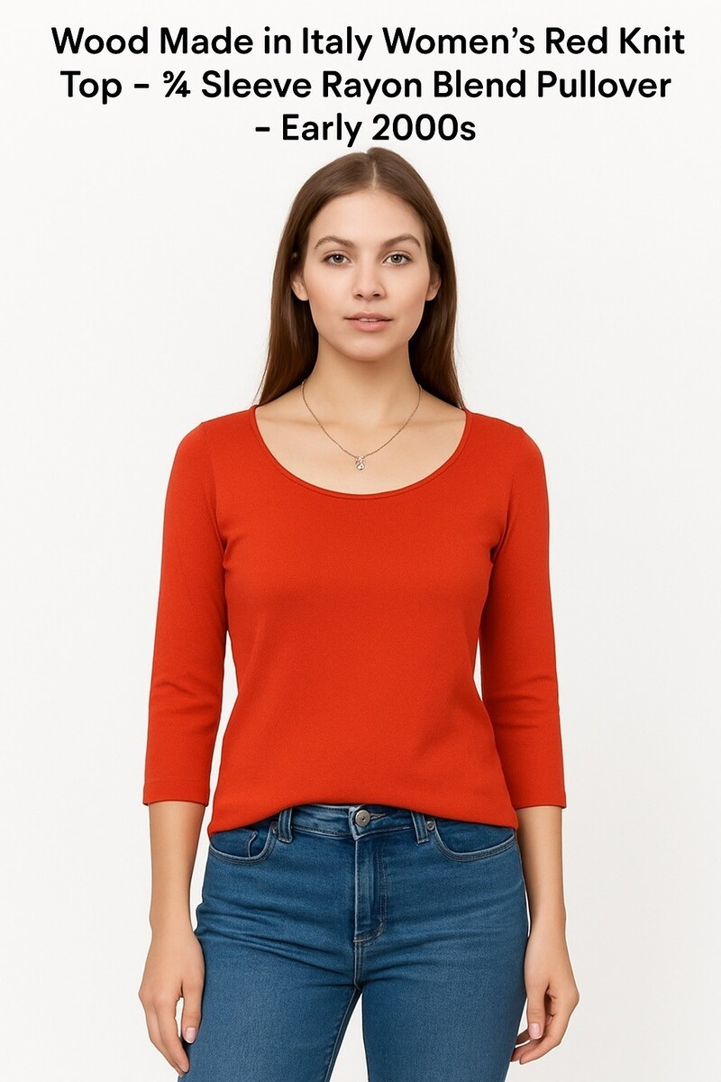A stylish and timeless **Wood** women?s knit top made in Italy, crafted from a smooth, lightweight rayon-blend fabric in a vivid **orange-red** hue. This pullover features a flattering scoop neckline and -length sleeves, offering a classic early-2000s silhouette perfect for casual or office wear. Soft, breathable, and easy to style with jeans, skirts, or tailored pants.