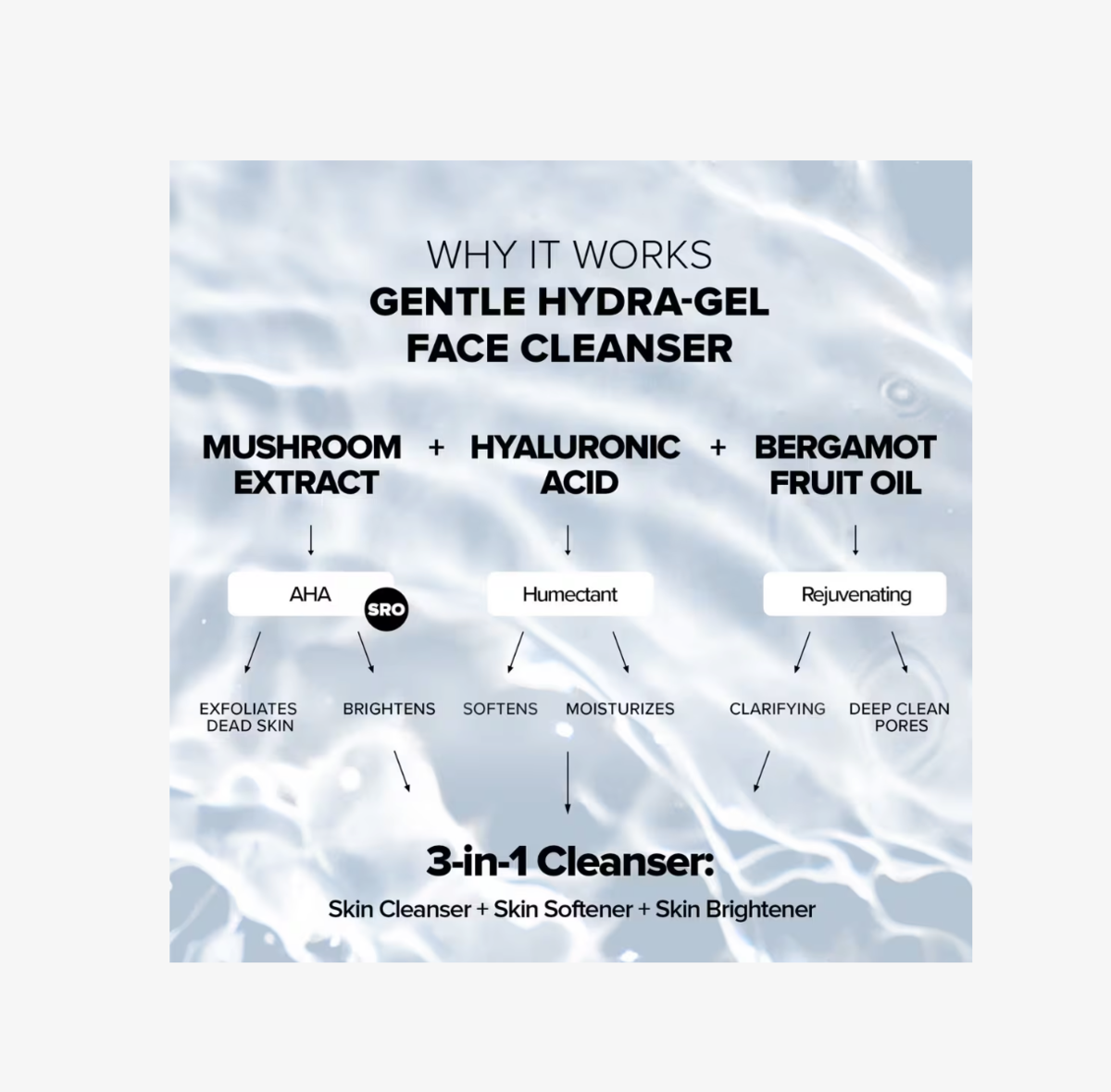 Skin Brightener: Natural AHAs gently exfoliate and brighten skin. Mushroom extracts to brighten skin. Cicer Seed Extract brightens to improve skin tone.