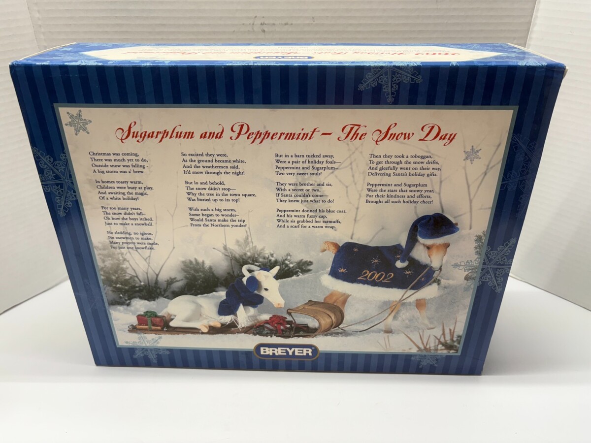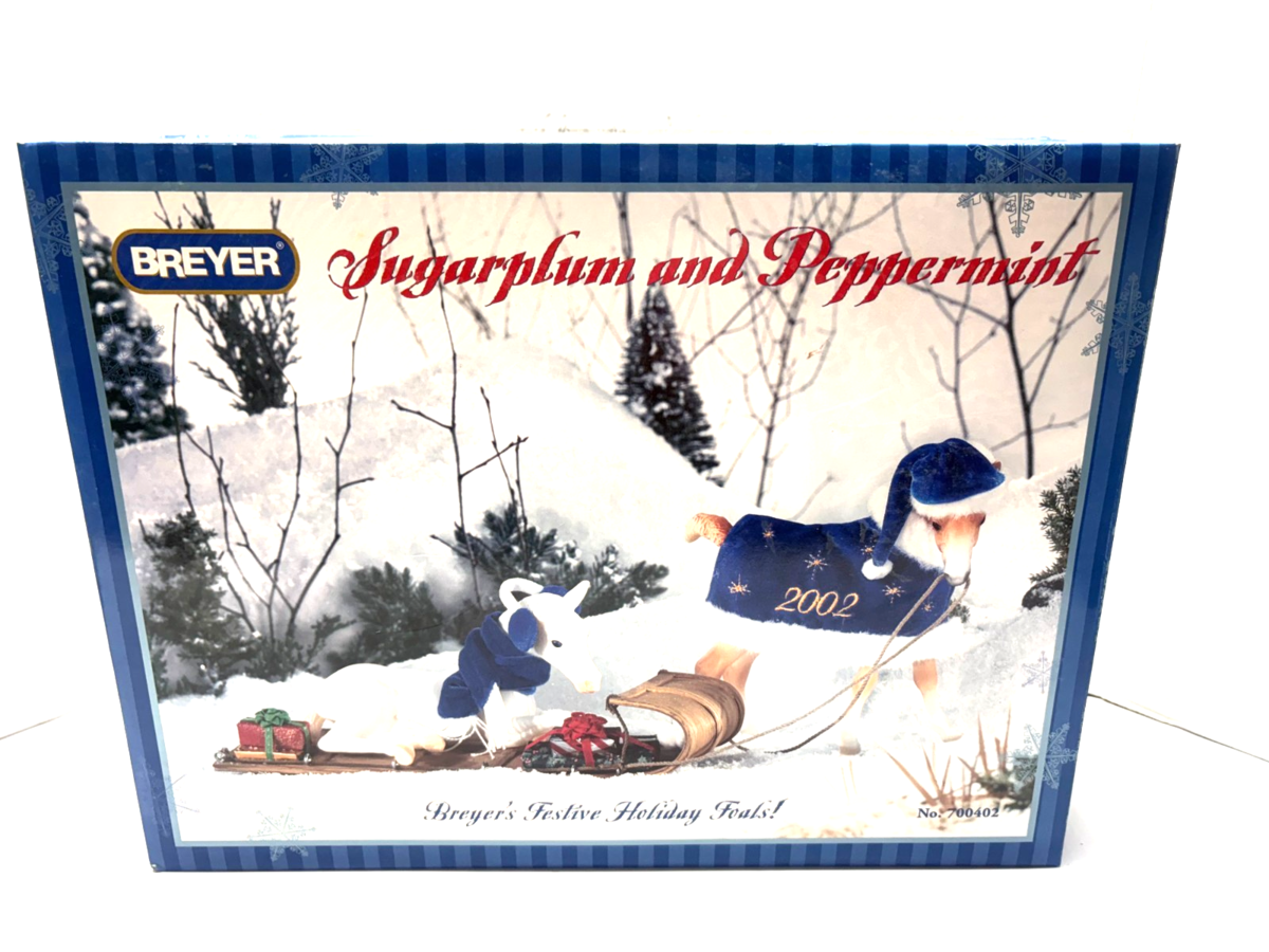 The Breyer Festive Holiday Foals Sugarplum Peppermint Special Edition #700402 is a traditional 12 x 9 inch collectible model horse from the Breyer Classics series. Made of plastic, this special edition features two holiday-themed horse figurines - Sugarplum and Peppermint. With intricate details and quality craftsmanship, these festive foals are a perfect addition to any horse collector's display. NIB. The Styrofoam has some vintage wear. SEALED.