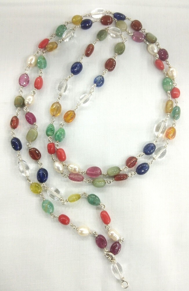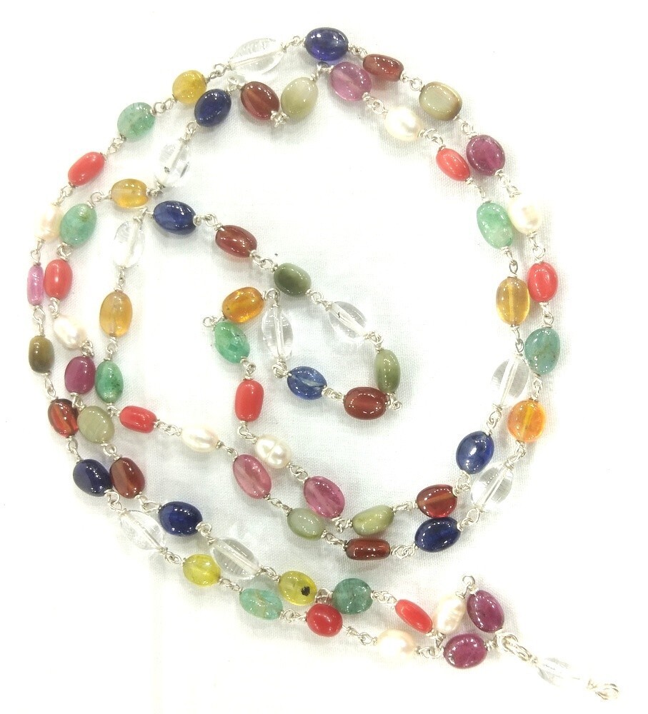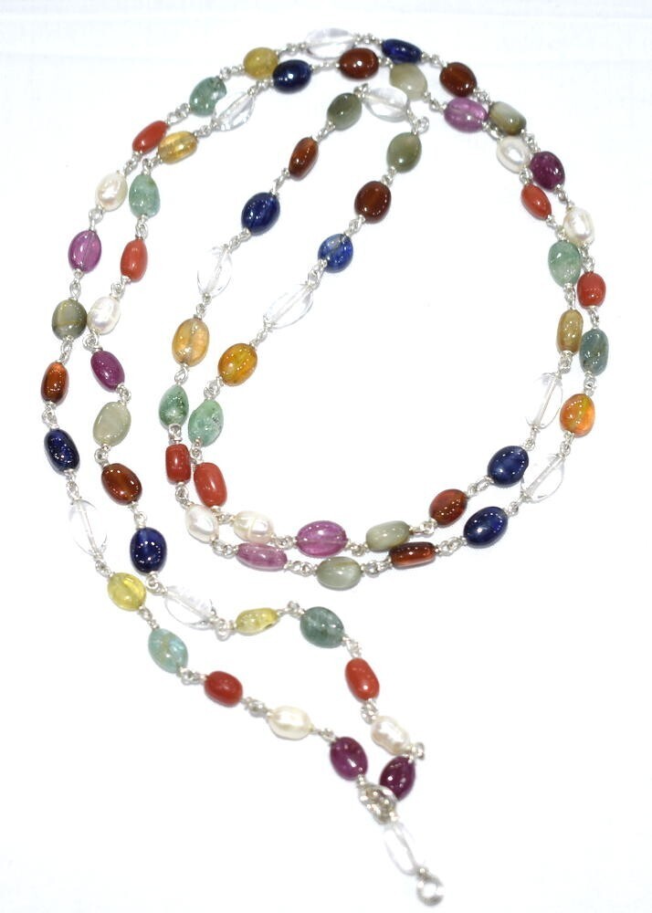 Design : Diese wunderschone Navratna Mala besteht aus reinem Silberdraht mit geknoteten Stil mit ovalen Edelsteinen mit ovaler Form - roter Koralle, gelber Saphir, blauer Saphir, Perle, Katze Auge, Gomed, Kristall (Sphatik), Emerald und Rubin.