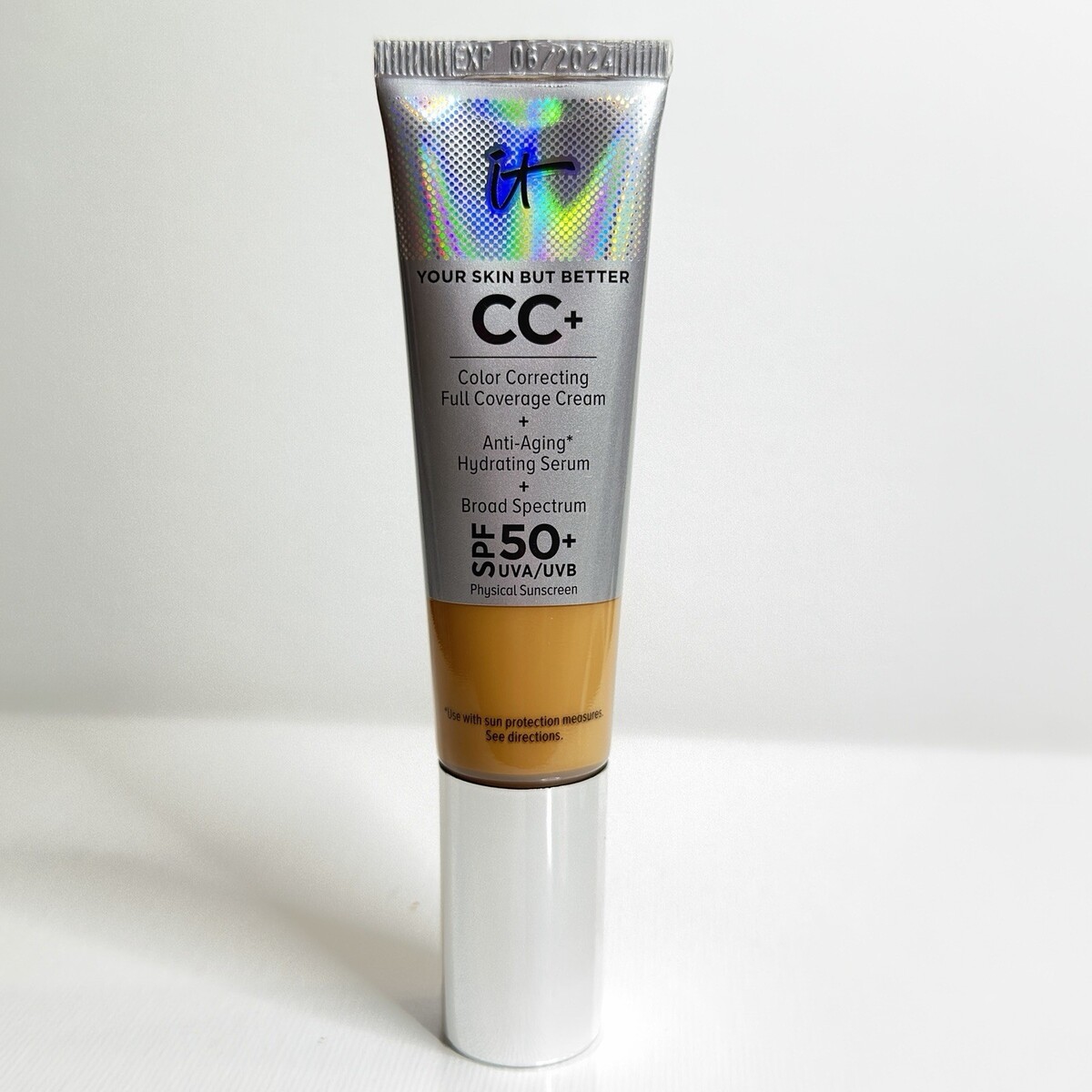 IT Cosmetics Your Skin But Better CC+ Cream SPF 50+ combines full-coverage foundation, anti-aging serum, and broad-spectrum sunscreen in one multi-tasking tube. This color-correcting cream instantly camouflages redness, dark spots, uneven tone, and imperfections for a flawless, natural finish. Infused with hyaluronic acid, niacinamide, and vitamin E, it hydrates and plumps skin while providing up to 24-hour wear. Developed with plastic surgeons and dermatologists, this award-winning vegan formula is suitable for all skin types and offers advanced sun protection without heavy feel or white cast.