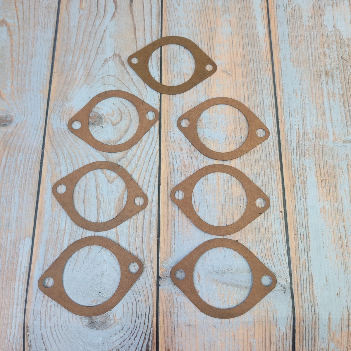 Exact item set is shown. Vintage new old stock paper gaskets with original packaging in fair condition. Inner diameter 2.25 inches, mounting holes 3.25 inch center to center. Made in USA. No returns on installed items or partial sets. Please review our business policies in our store for information regarding returns, shipping and warranties.