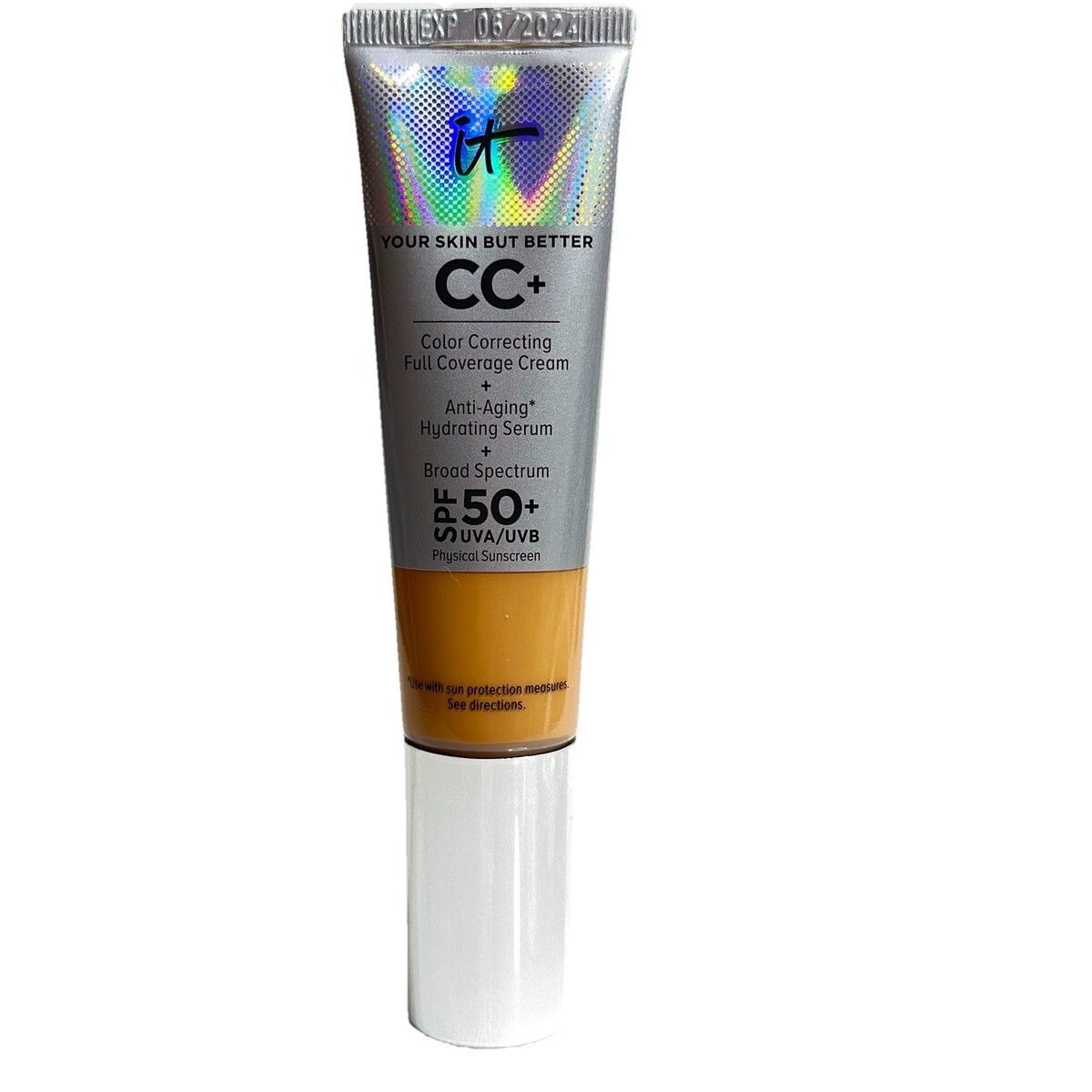 IT Cosmetics Your Skin But Better CC+ Cream SPF 50+ combines full-coverage foundation, anti-aging serum, and broad-spectrum sunscreen in one multi-tasking tube. This color-correcting cream instantly camouflages redness, dark spots, uneven tone, and imperfections for a flawless, natural finish. Infused with hyaluronic acid, niacinamide, and vitamin E, it hydrates and plumps skin while providing up to 24-hour wear. Developed with plastic surgeons and dermatologists, this award-winning vegan formula is suitable for all skin types and offers advanced sun protection without heavy feel or white cast.