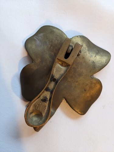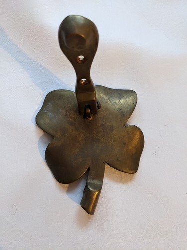 A vendre est un heurtoir de porte en metal en laiton Shamrock Lucky Four Leaf Clover d'occasion.