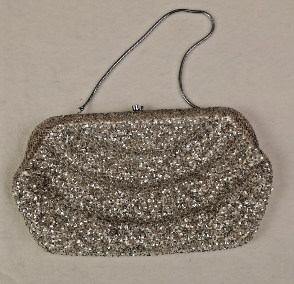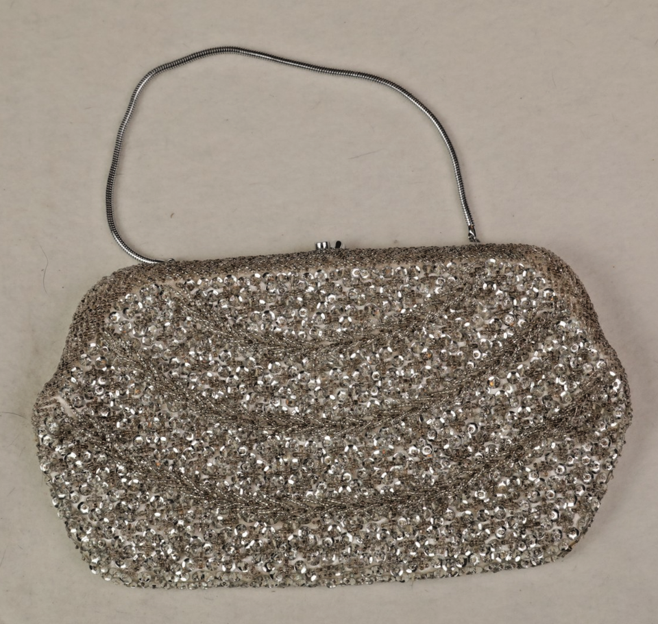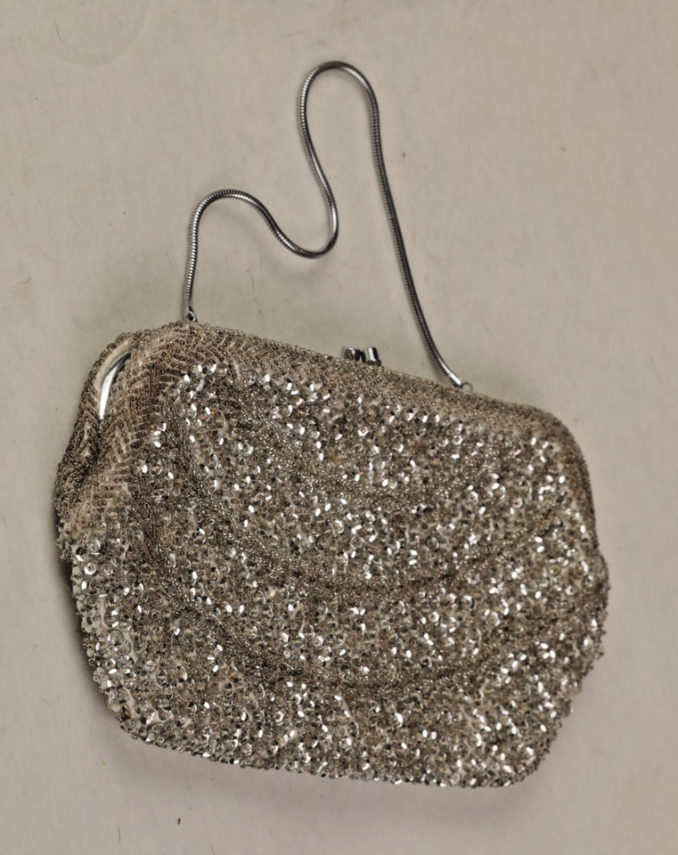 Silver Beaded Sequin Clutch Purse Evening Bag Slinky Chain Strap Hong Kong VTG