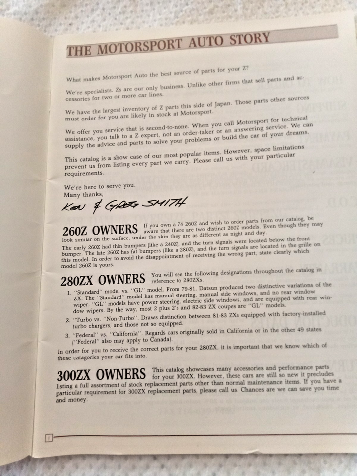 Motorsport Auto Parts Catalog Datsun 260Z 280ZX 300ZX Z Cars 1984