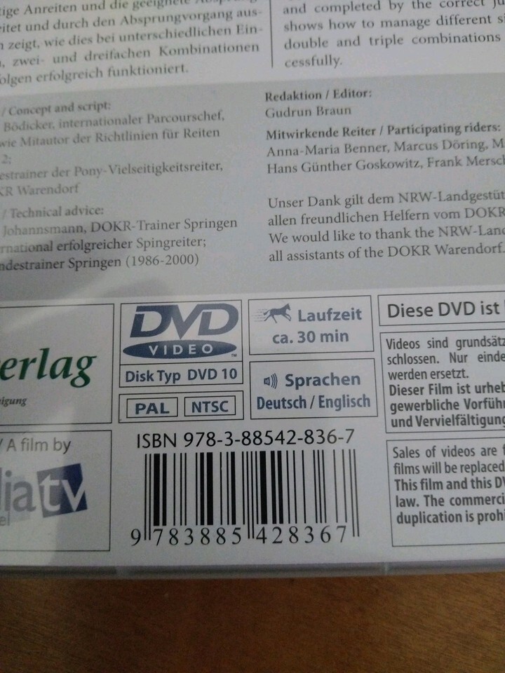 The "Springreiten Show Jumping For Advanced Riders" DVD is a valuable resource for equestrians looking to enhance their show jumping skills. With both German and English language options, riders can learn from expert instruction and techniques to improve their performance in the arena. This DVD collection offers advanced training exercises and tips for riders looking to take their skills to the next level in the sport of show jumping.