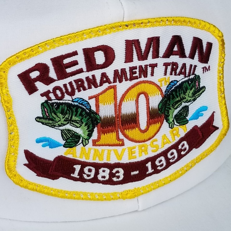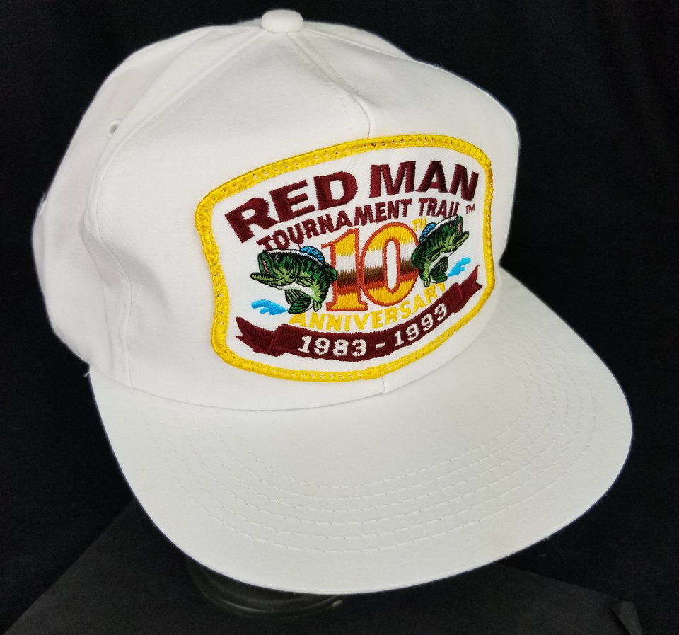 Vintage trucker style hat. Red Man fishing tournament chewing tobacco advertising.