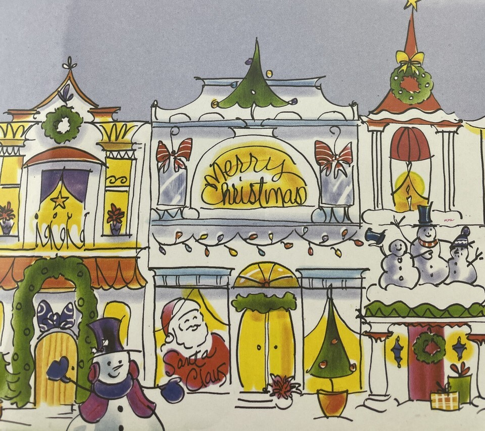 Seasons Greetings with image of Santa flying his sleigh over the shops on Main Street. Colors are light blue gray background with the graphics in red, green and gold.