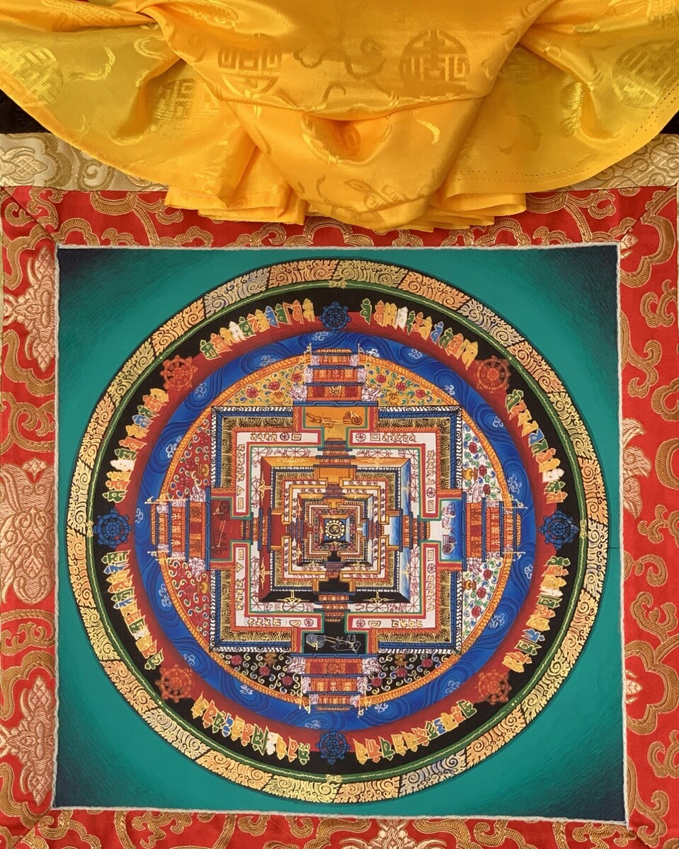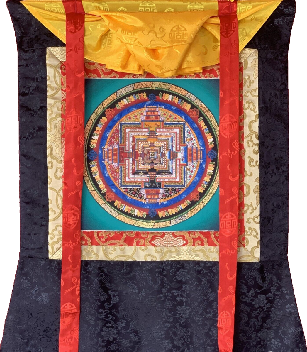 HAND PAINTED GREEN KALACHAKRA MANDALA TIBETAN THANGKA PAINTING WITH SILK BORDER