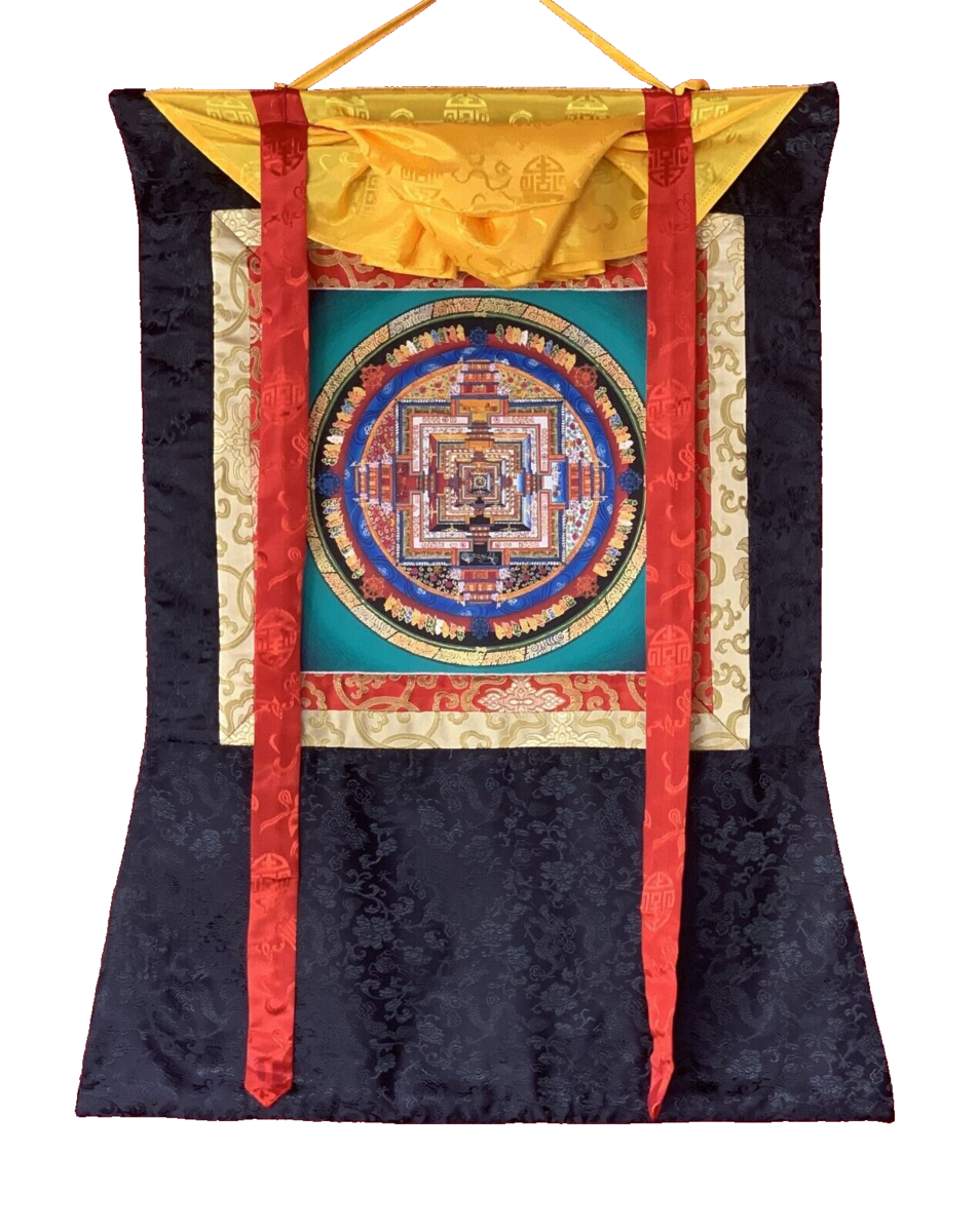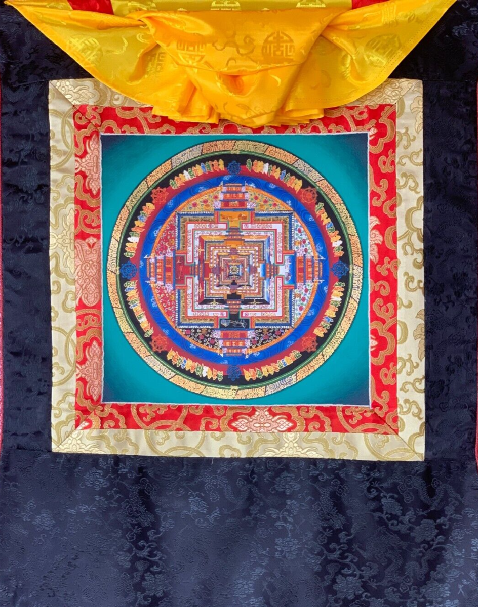 HAND-PAINTED KALACHAKRA MANDALA -THE WHEEL OF LIFE CIRCLE ORIGINAL- UNIQUE TIBETAN THANGKA PAINTING, BUDDHIST ART WITH SILK BORDER/BROCADE