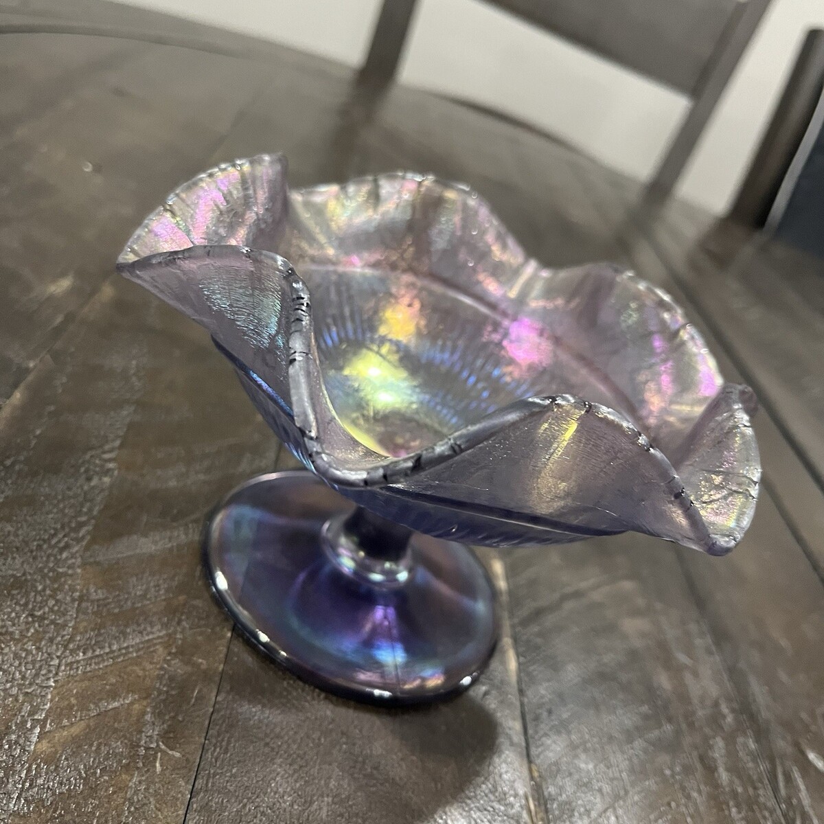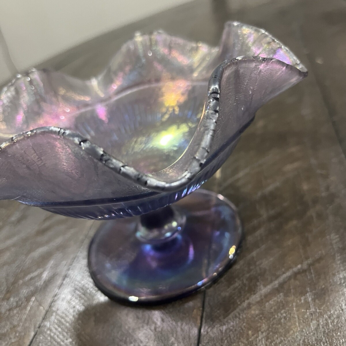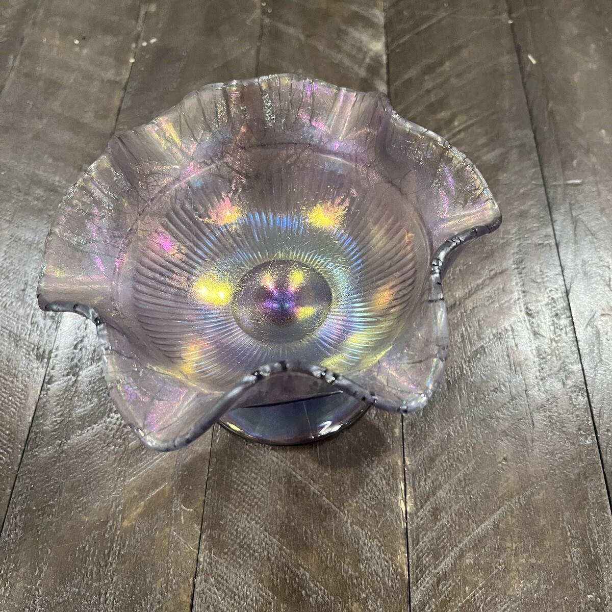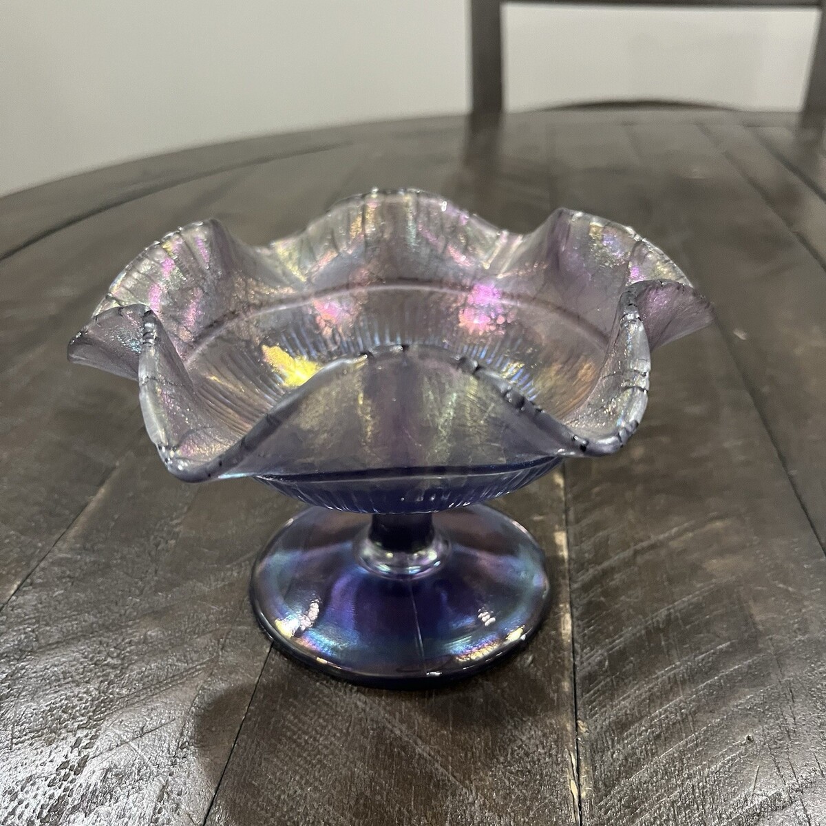 Fenton Amethyst Satin Iridescent Stretch Glass Compote Ruffle Purple Candy Dish