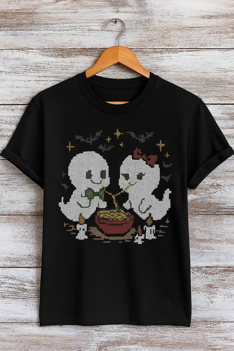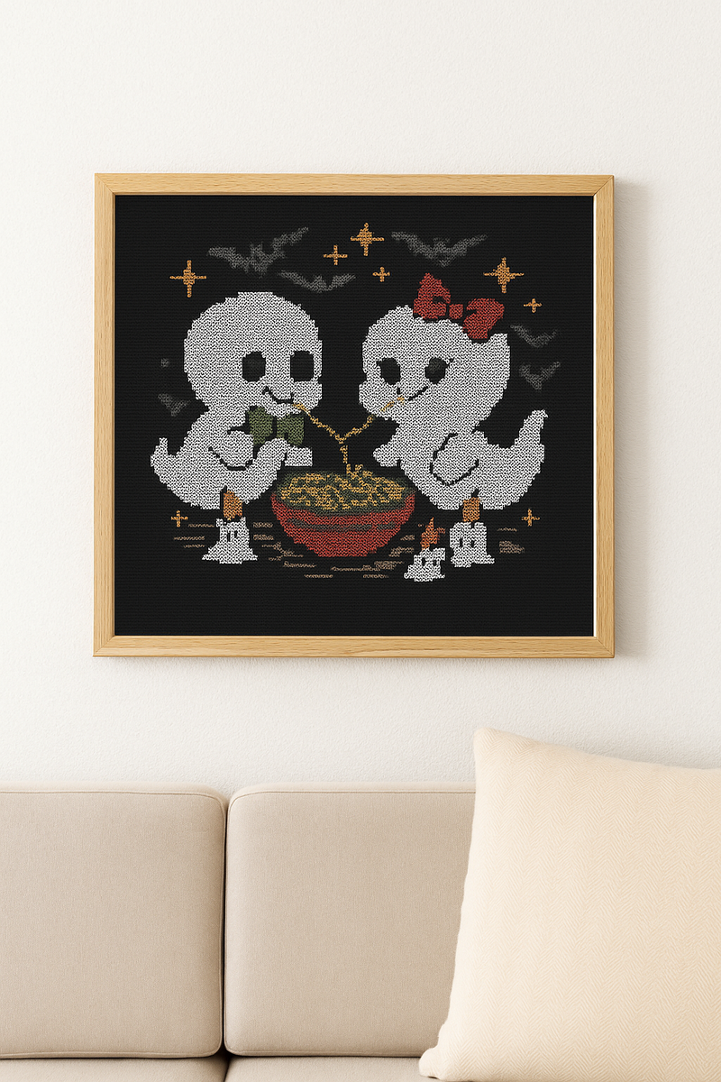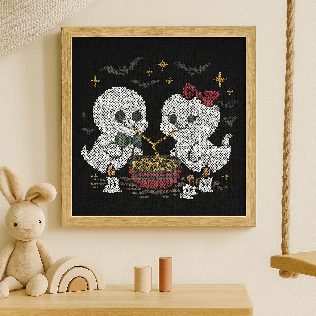 Celebrate Halloween with this charming and funny cross stitch pattern featuring two baby ghosts sharing noodles from one bowl — a spooky twist on a romantic dinner! ??