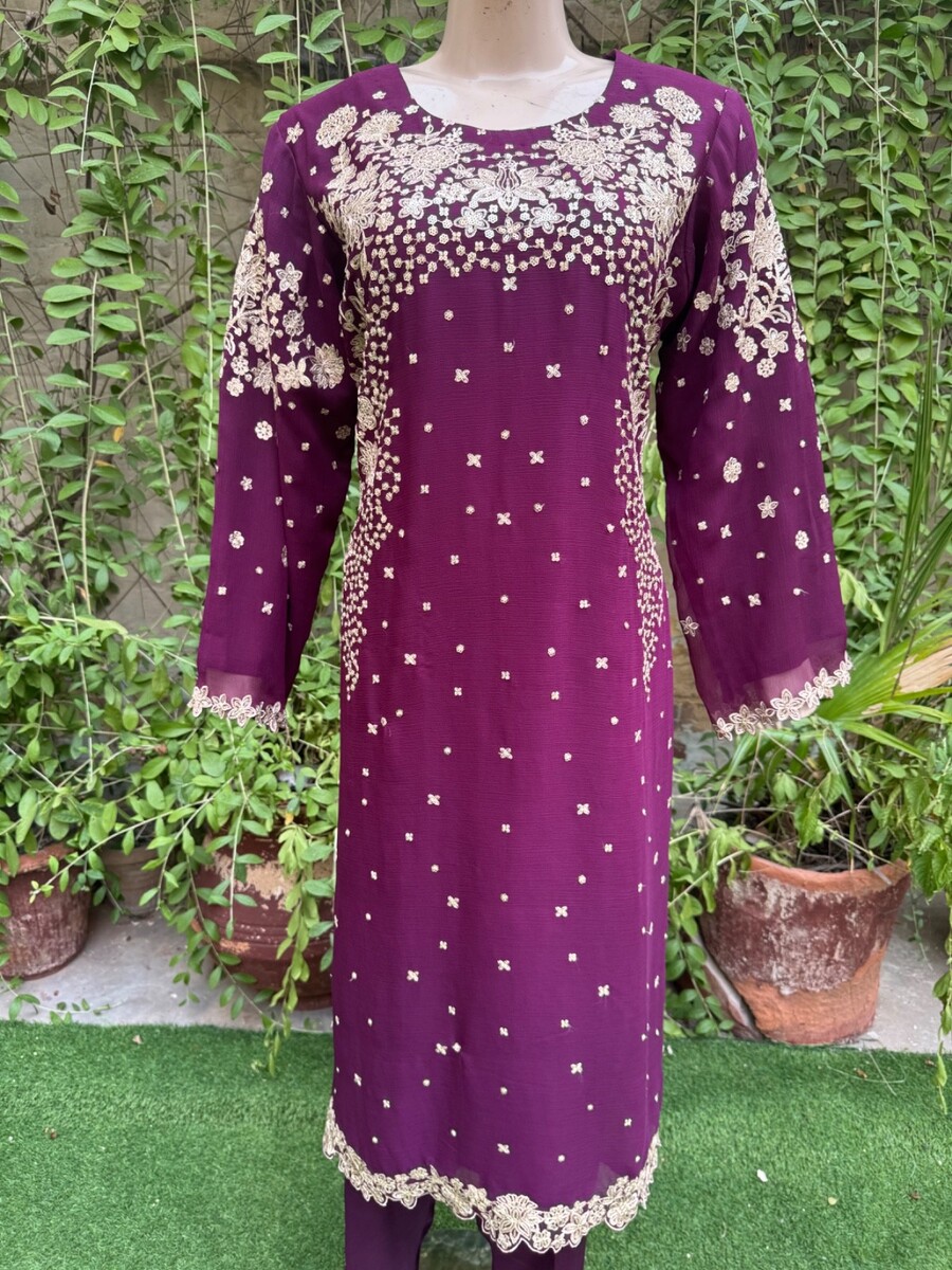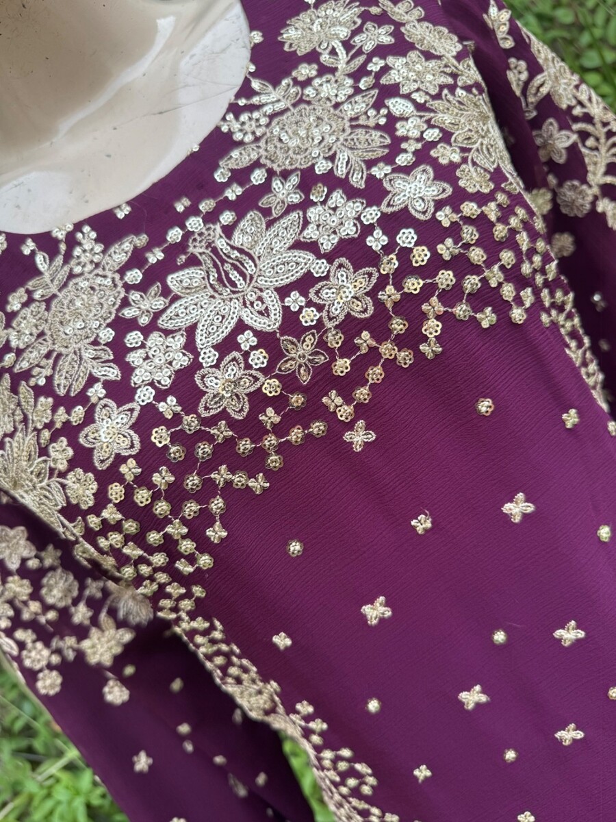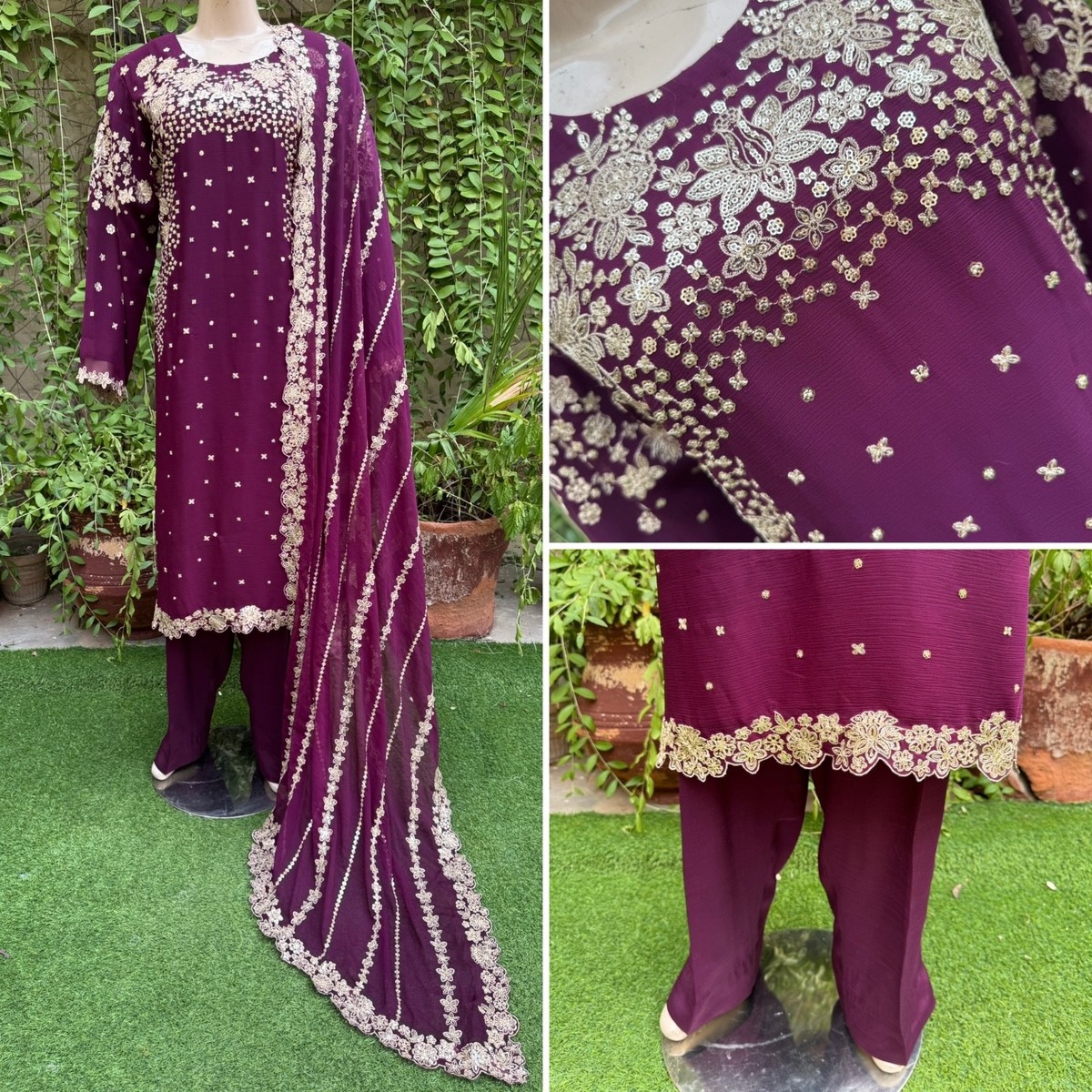 Pakistani Magenta 3 Pcs Fancy Chiffon Dress with thread embroidery ,XL