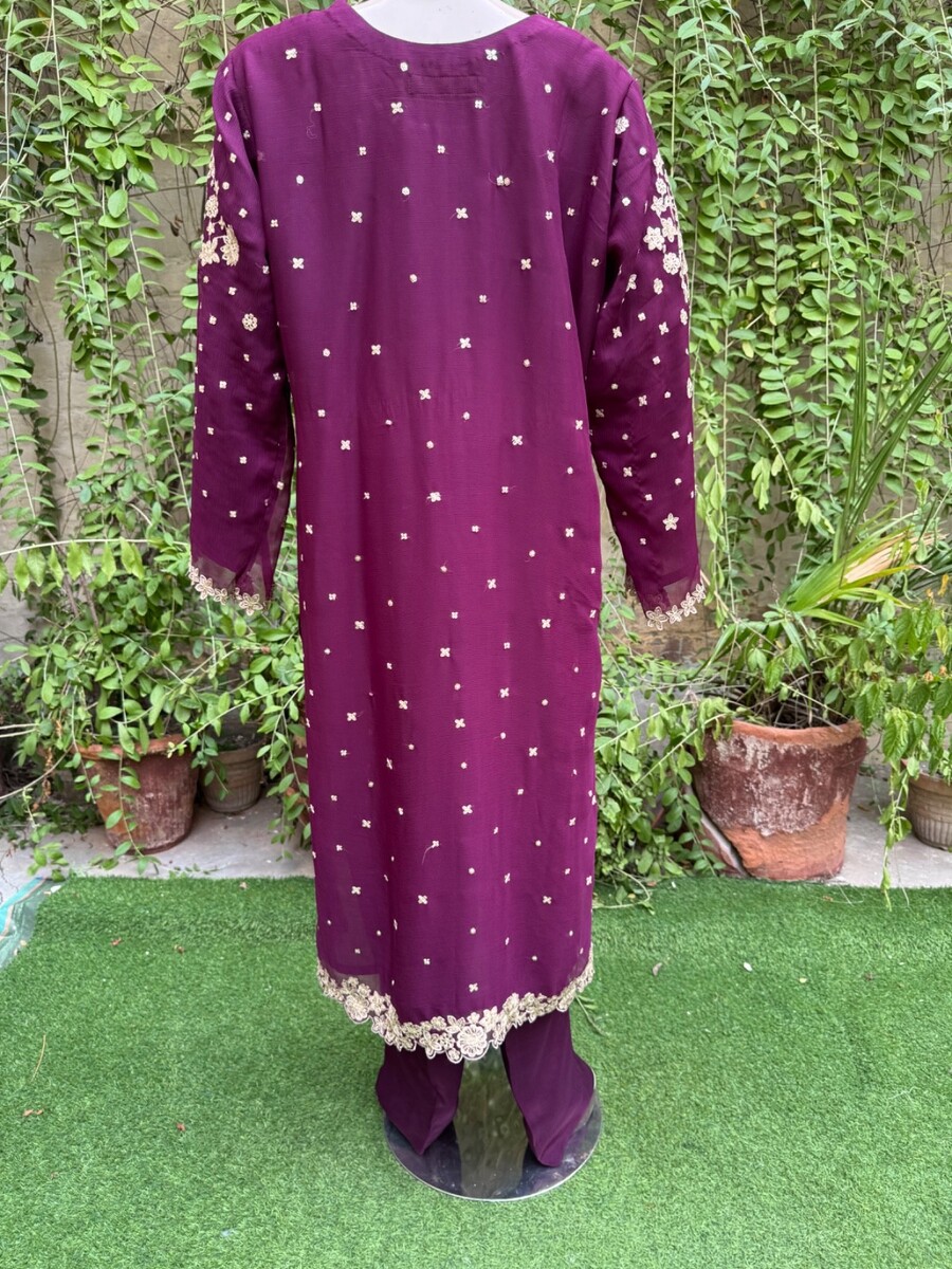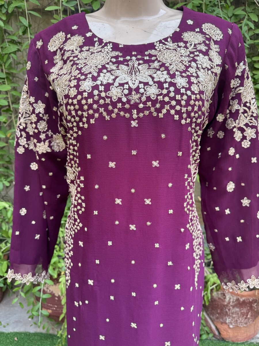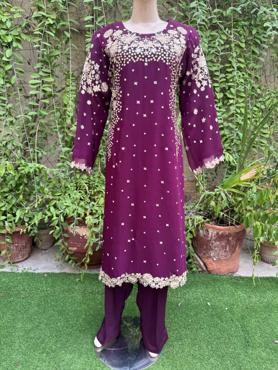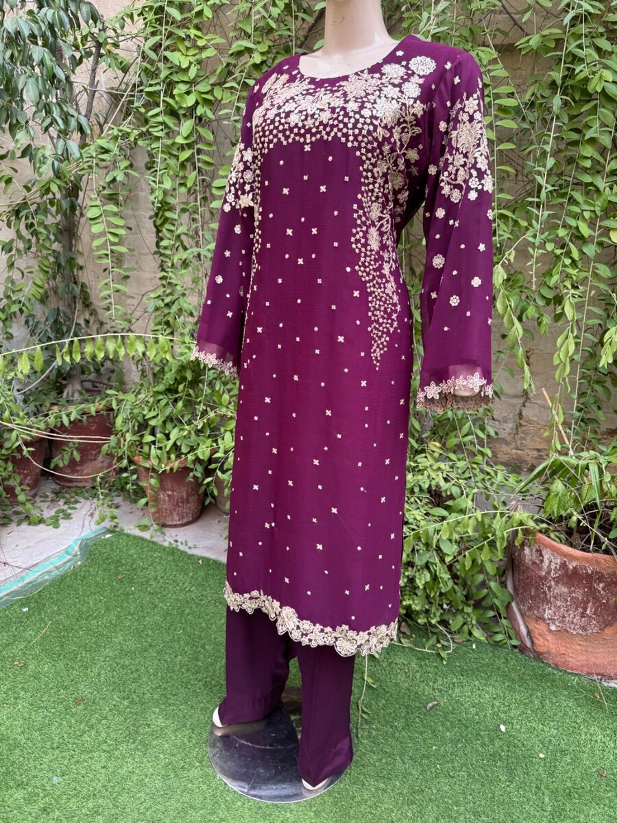 Pakistani Magenta 3 Pcs Fancy Chiffon Dress with thread embroidery ,XL