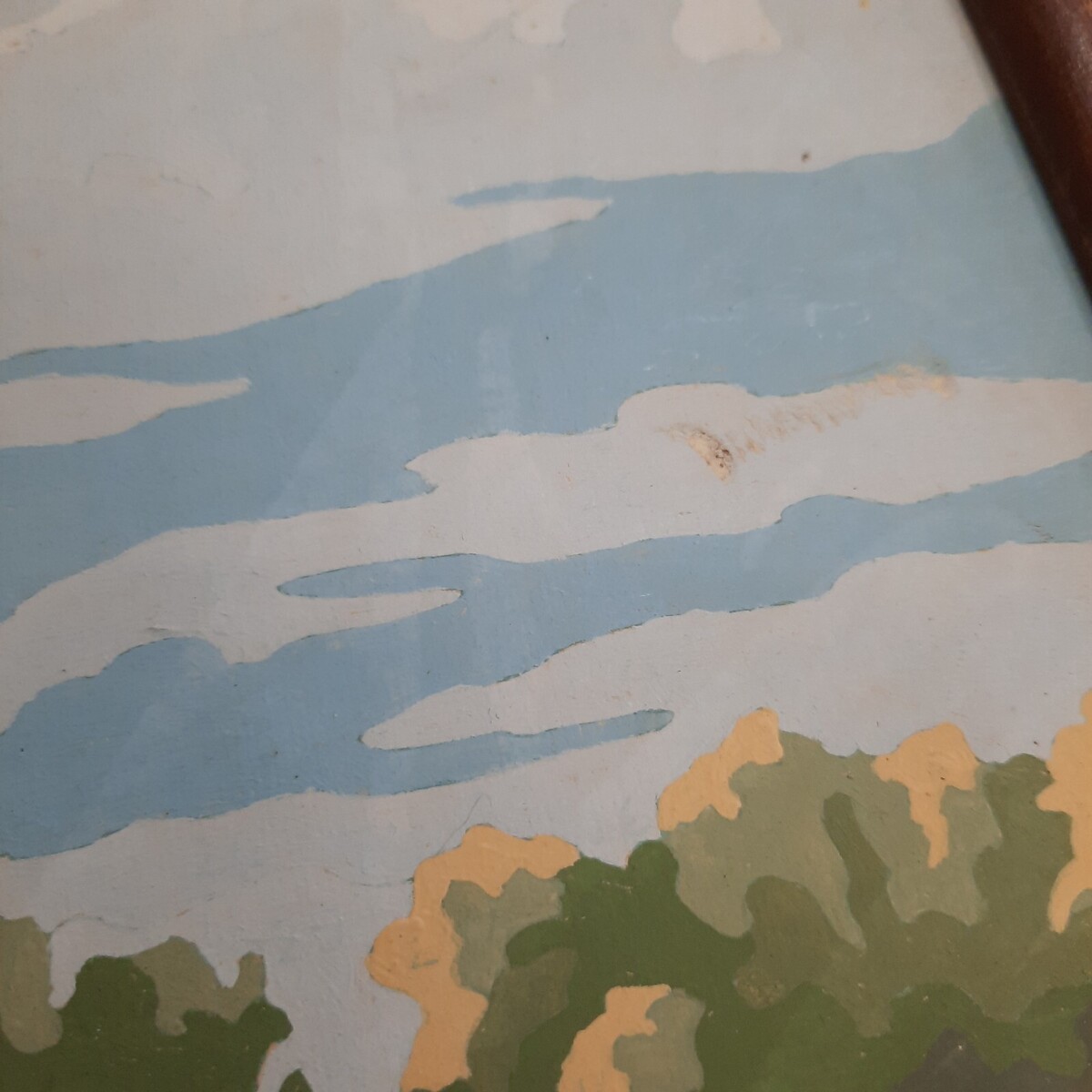 Some small holes/scraps/scratches/imperfections as shown. See pics. Comes in wood frame ready to hang. Probably from the 60s-70s.