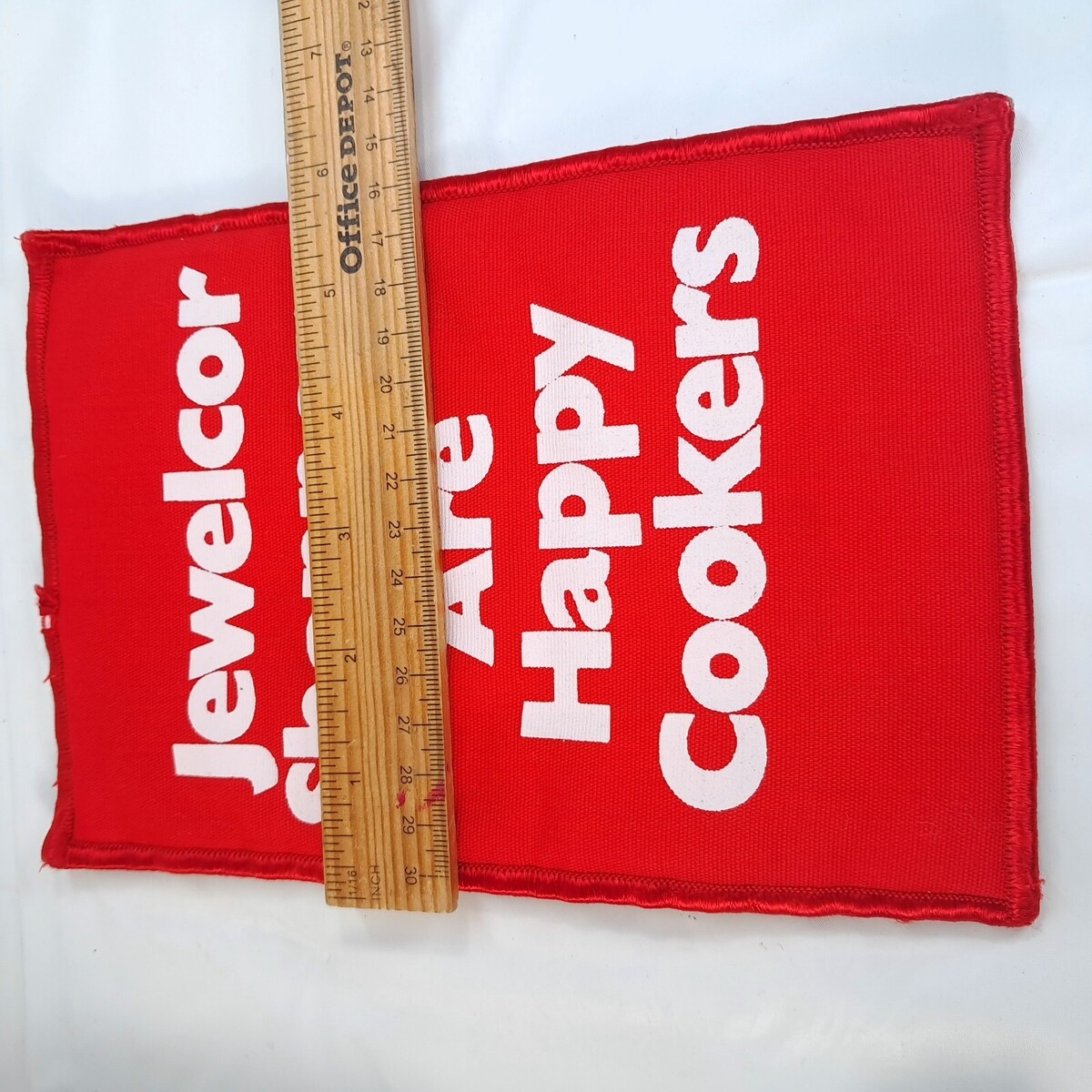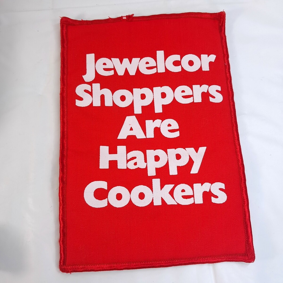Red fabric trivet with white lettering. Some missing stitches/wear as shown. See pics.