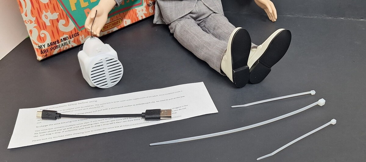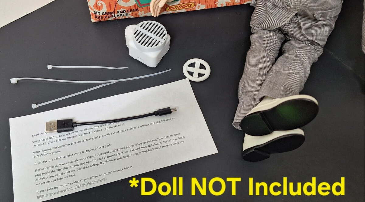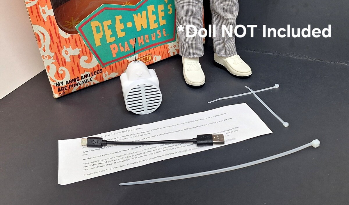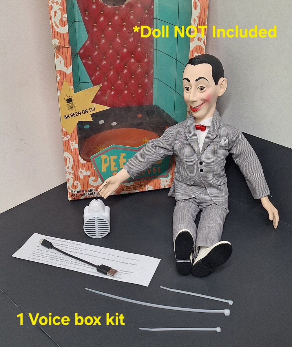 These are hand made by me and in my own design of 3D voice box case. These are not to be given to children to toss around. I'm selling these for you to put into a Pee Wee Doll and then it's good to go. Comes with the working box and charging cable. Doll not included Sold as is.