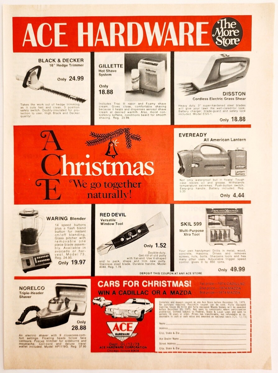 1973 ACE Hardware Store Advertisement Retail Christmas Sales Mazda Caddy DWP9D